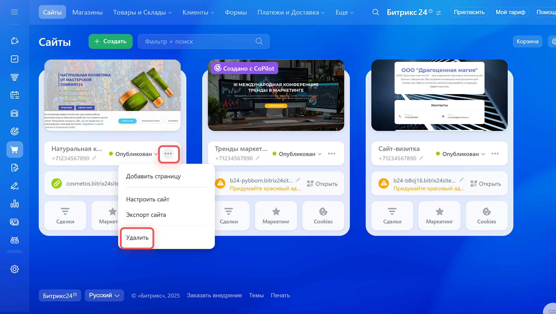 Нажмите на Три точки (...) > Удалить. Сайт переместится в корзину и будет храниться там 30 дней. В течение этого времени вы сможете его восстановить, позже — сайт будет удален окончательно.