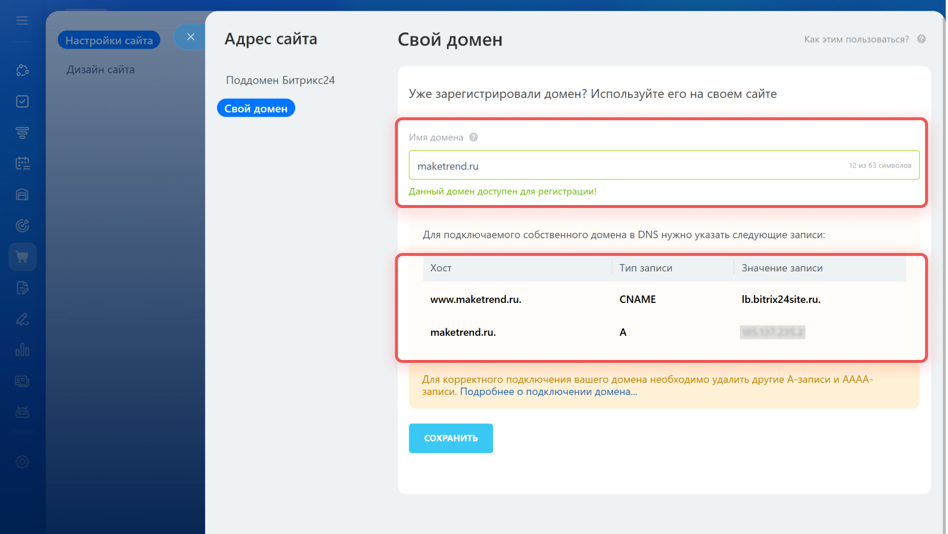 4. Вернитесь в Битрикс24 и сохраните настройки подключения домена. Переход на новый адрес занимает до трех дней.