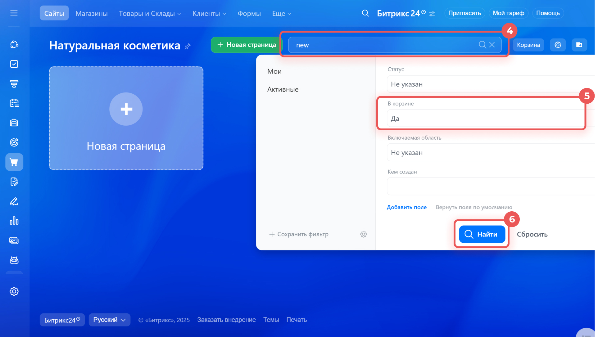5–6. Если дубликат не нашелся, добавьте фильтр — снова нажмите на строку поиска, для поля В корзине выберите значение Да и нажмите Найти.