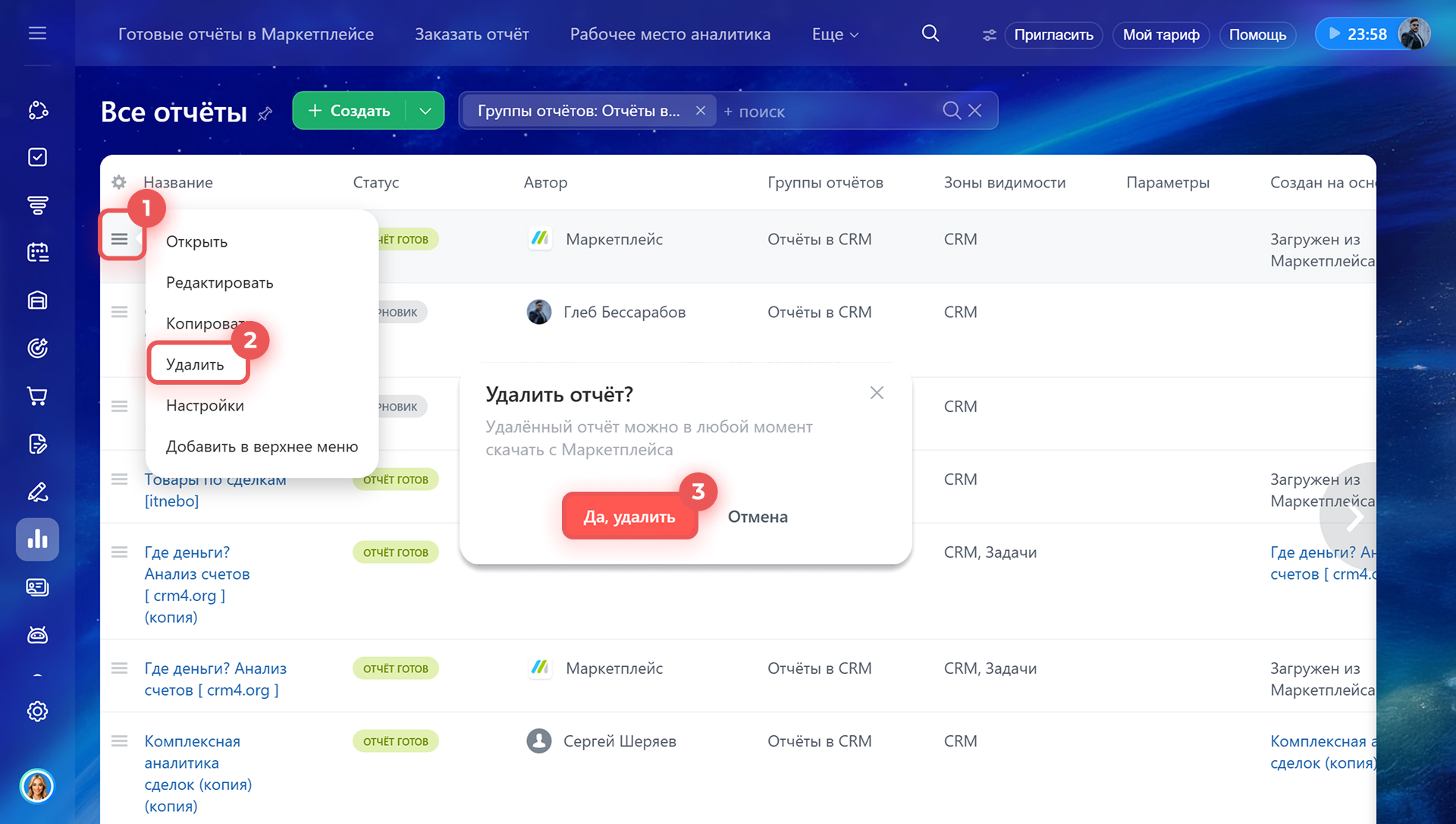 После этого вернитесь к нужному отчету, нажмите Меню (≡) > Удалить и подтвердите действие. Если связанные элементы удалены, отчет удалится без ошибок.