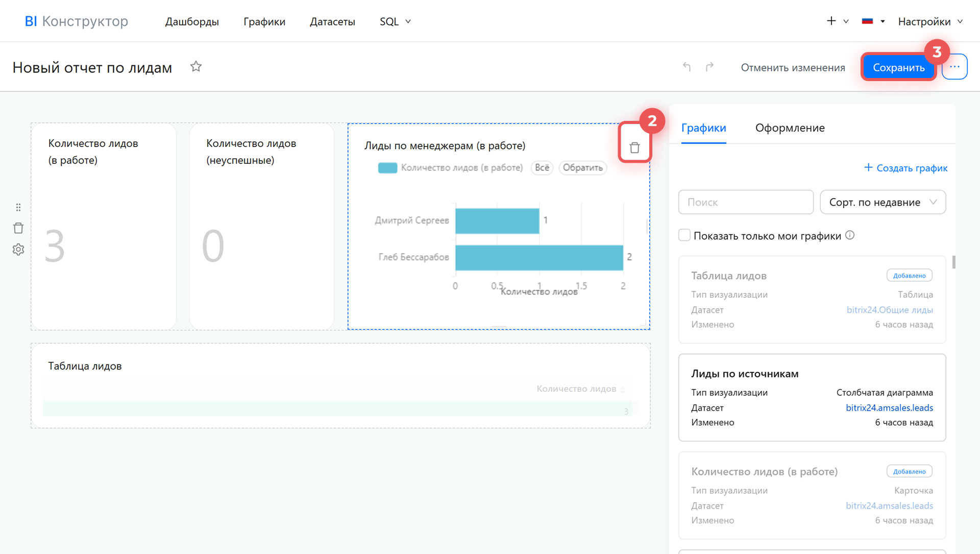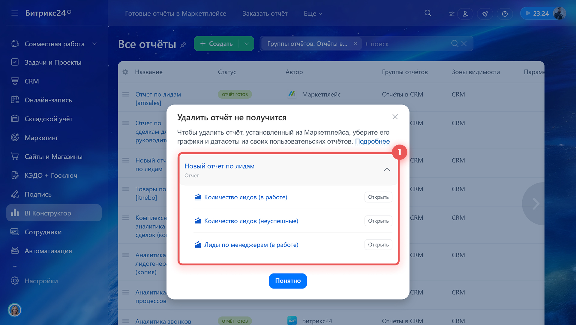 Битрикс24 покажет связанные элементы. Например, это может быть график или датасет, который вы использовали в своем отчете. Откройте отчет, удалите такие элементы и сохраните изменения.