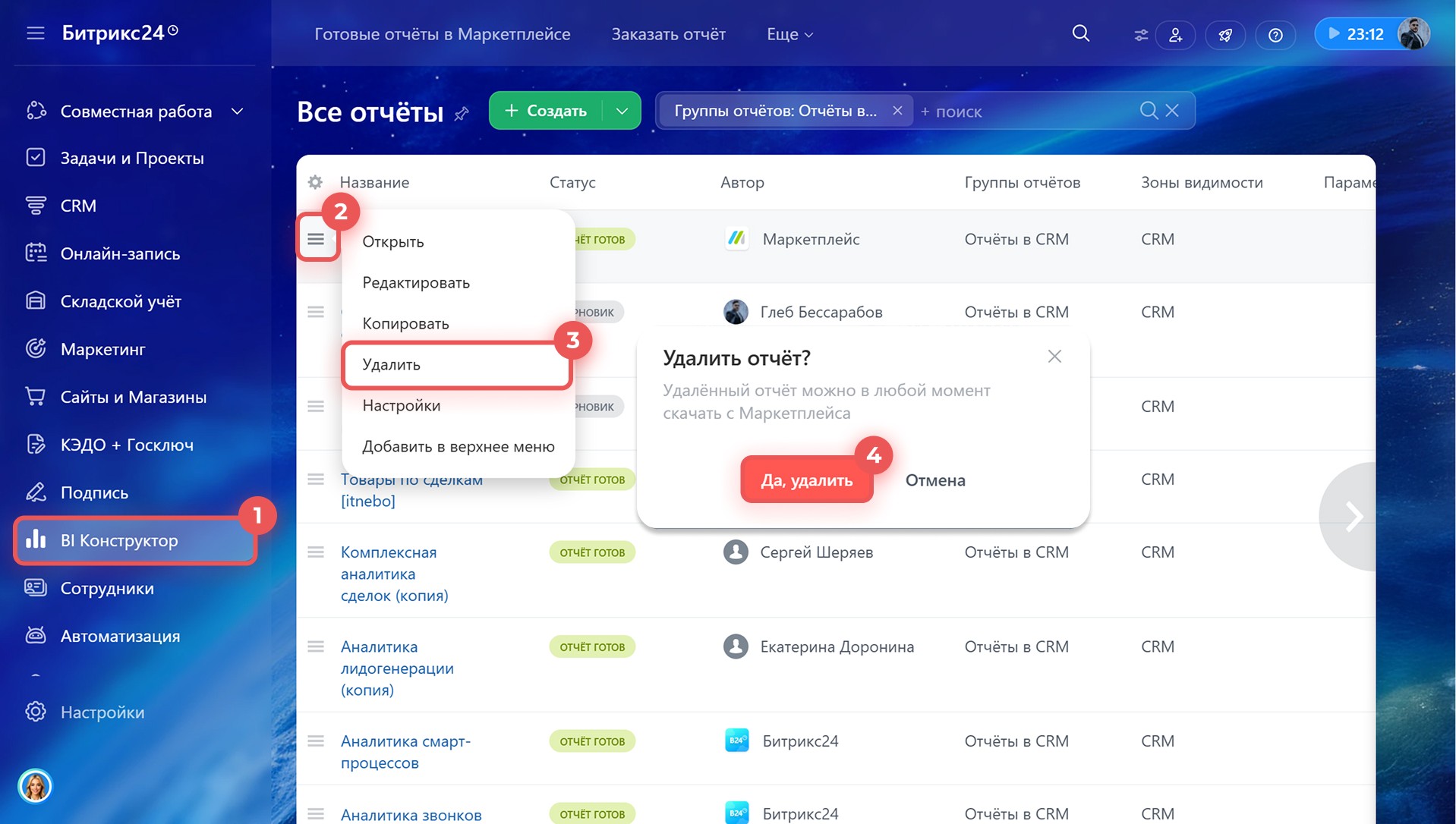 - Отчет, установленный из Битрикс24 Маркетплейса, можно удалить через меню действий в BI Конструкторе.
