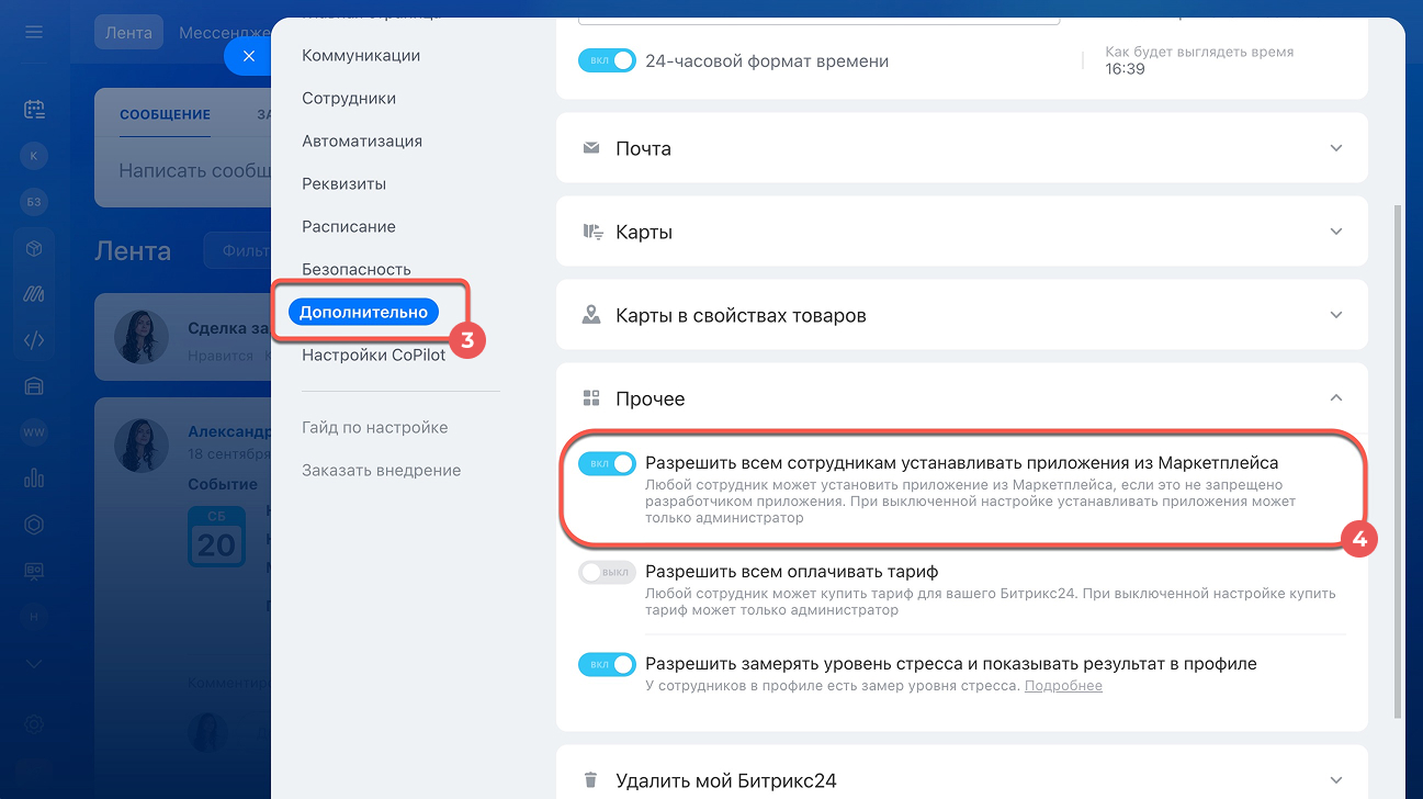 1–3. Перейдите в раздел Настройки (⚙️) > Настройки Битрикс24 > Дополнительно.