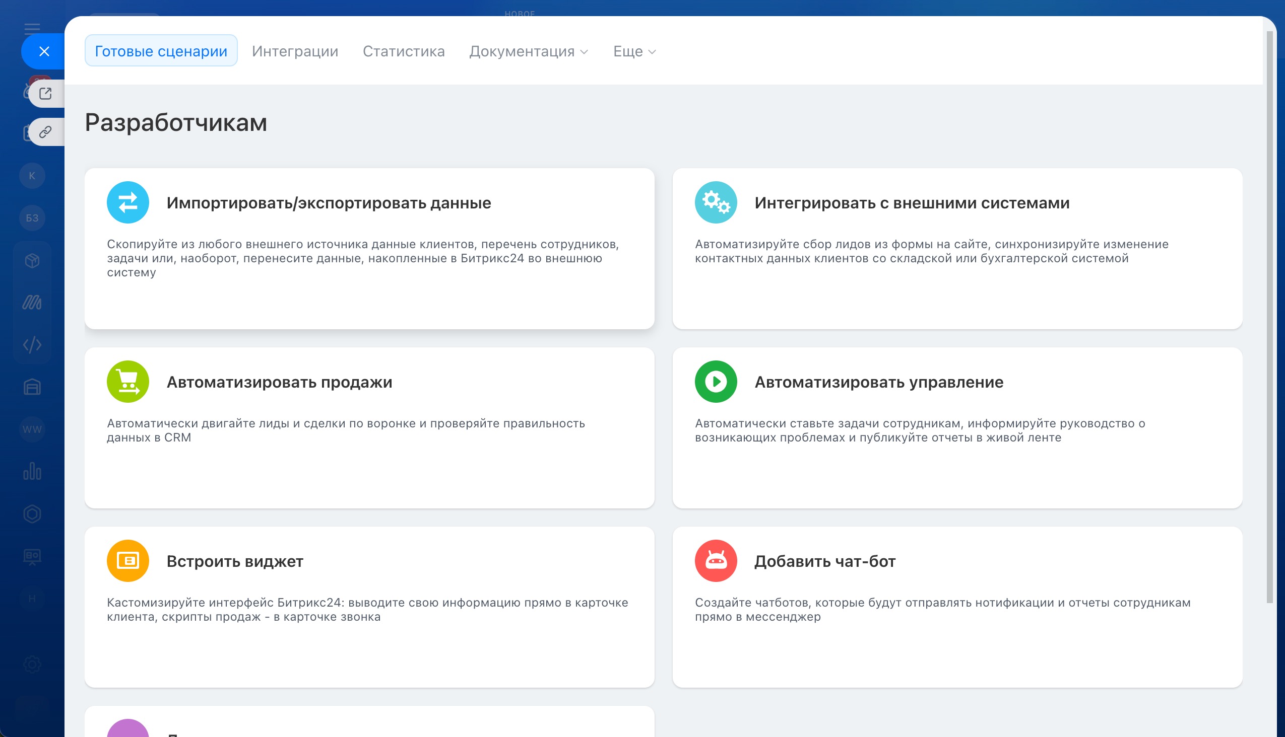 Раздел Разработчикам нужен компаниям, которые хотят создавать локальные приложения, интеграции или дорабатывать инструменты Битрикс24. В нем можно: