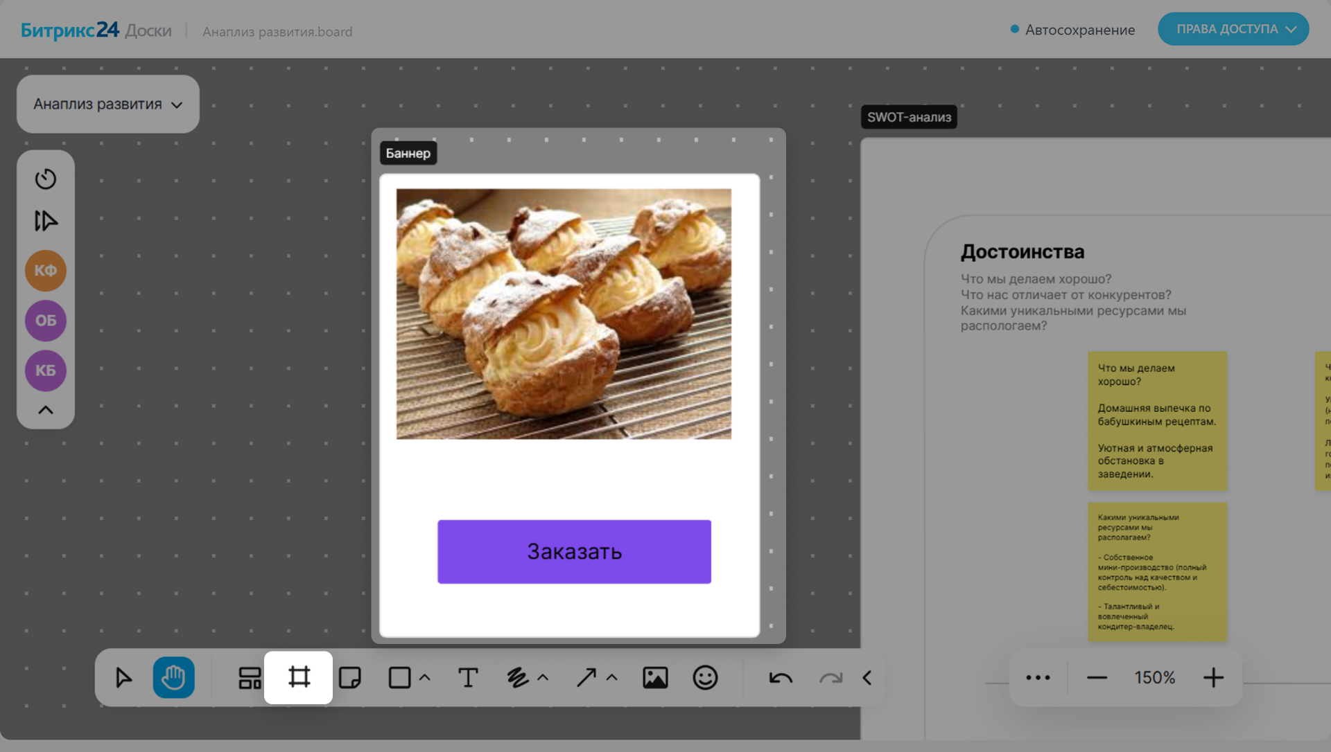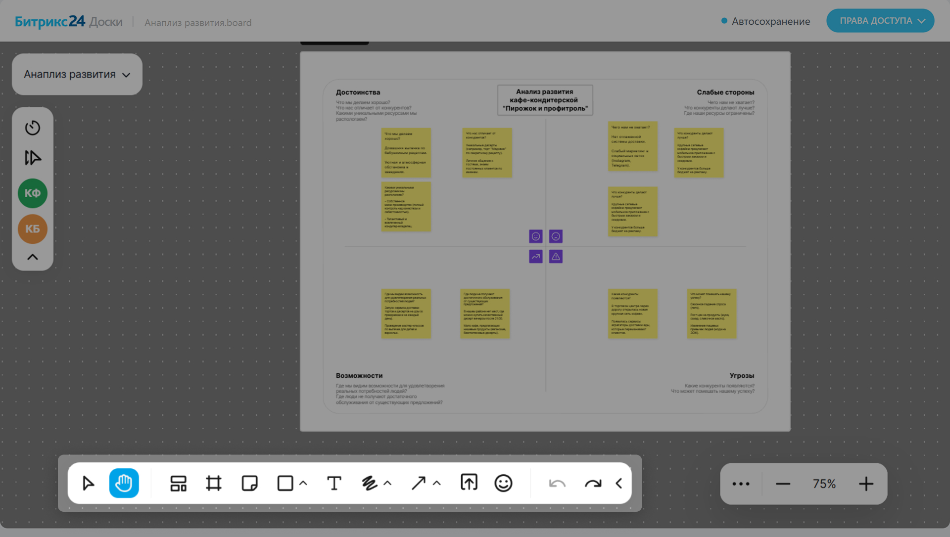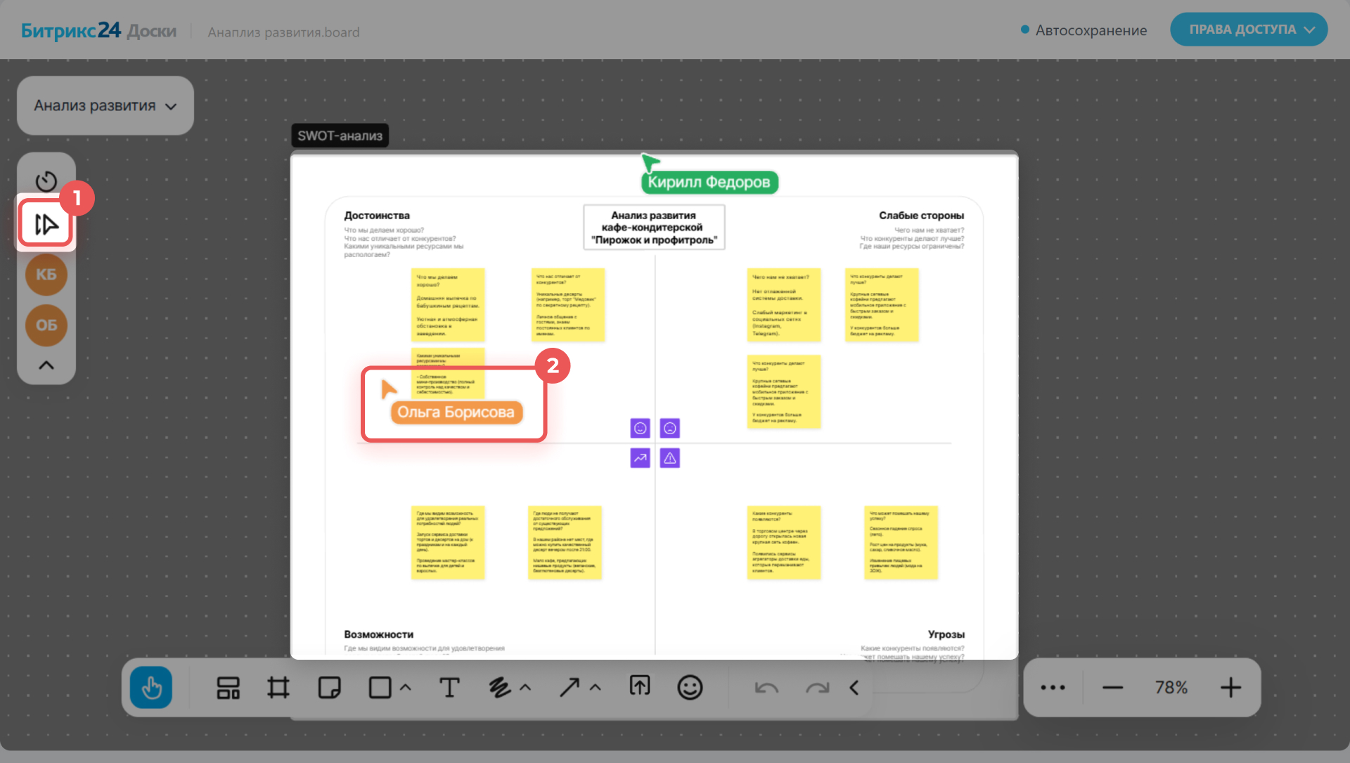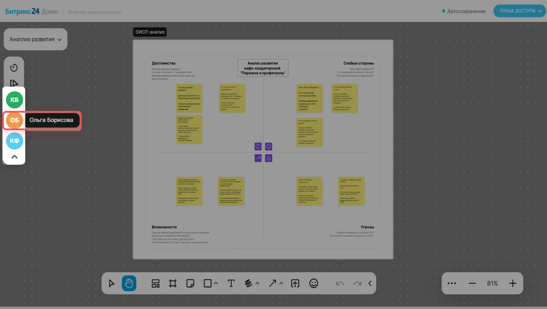 - Все изменения сохраняются автоматически: участники видят обновления в реальном времени и могут оставлять комментарии прямо на доске.