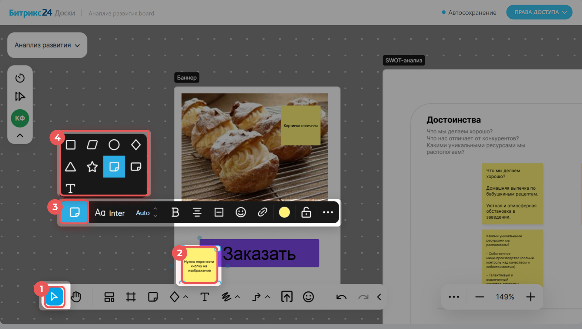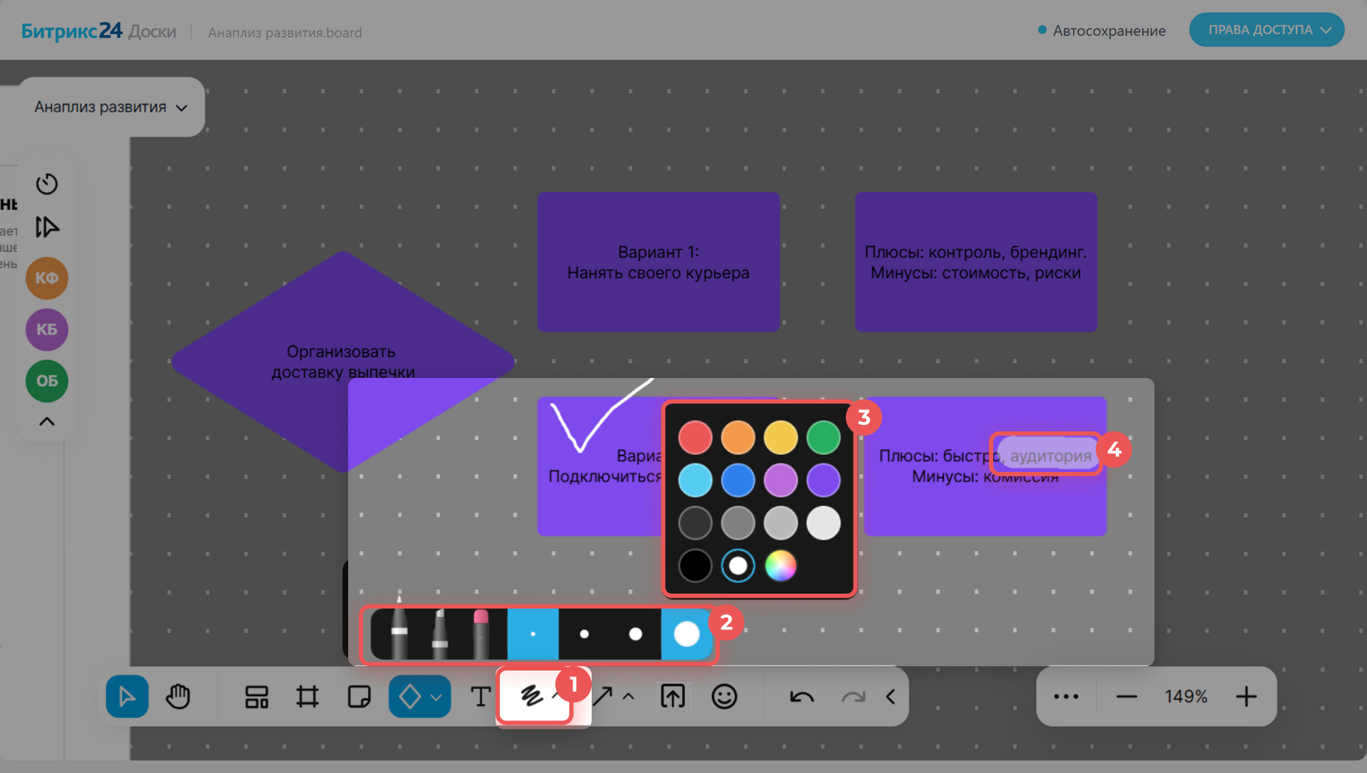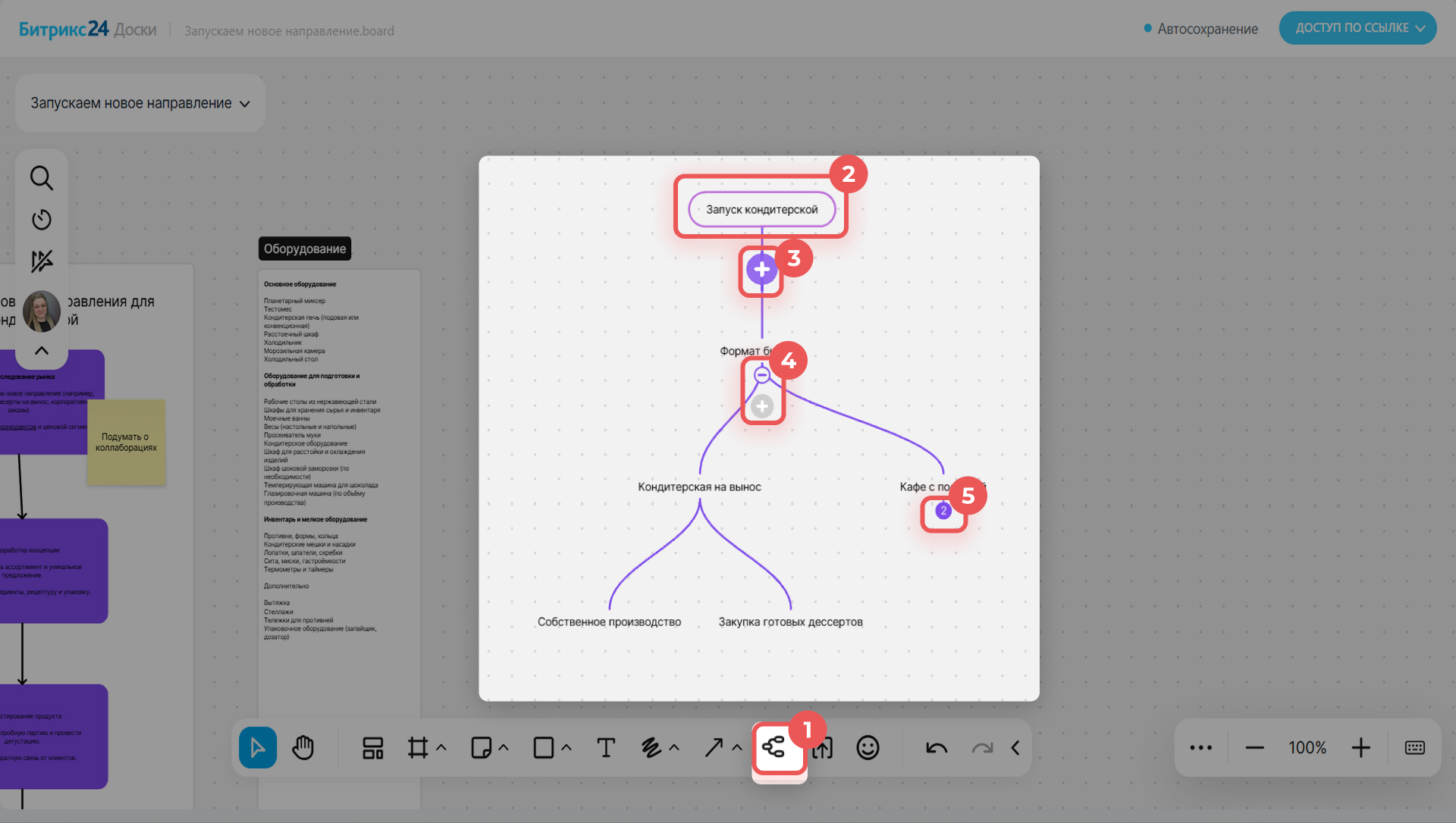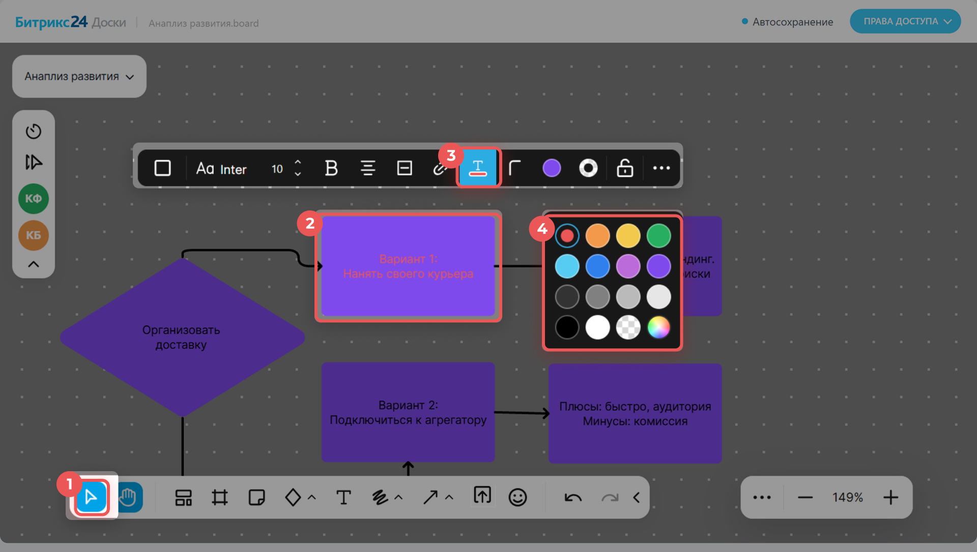- Все изменения сохраняются автоматически: участники видят обновления в реальном времени и могут оставлять комментарии прямо на доске.