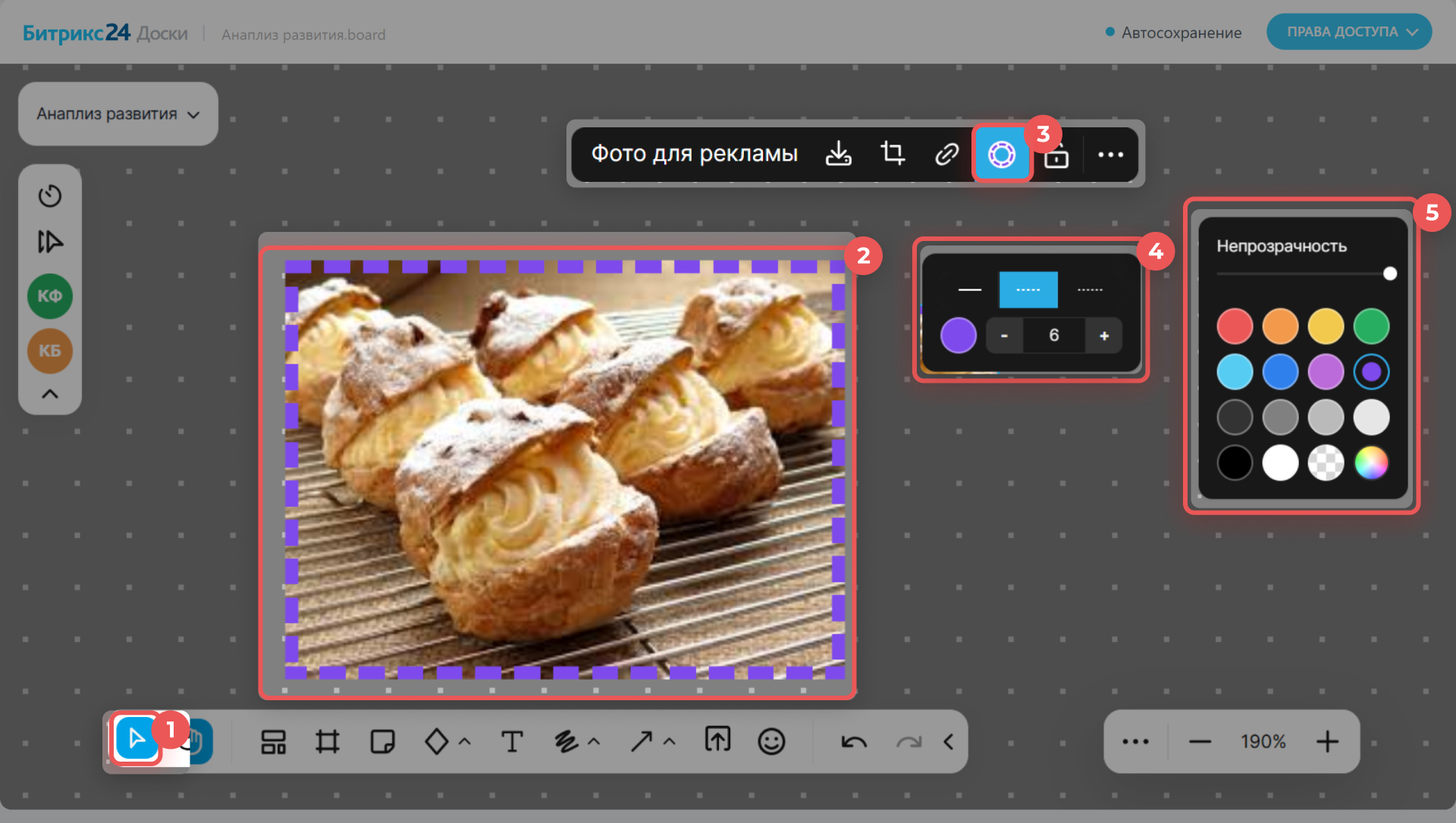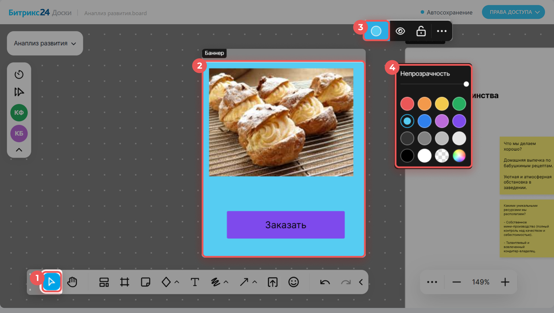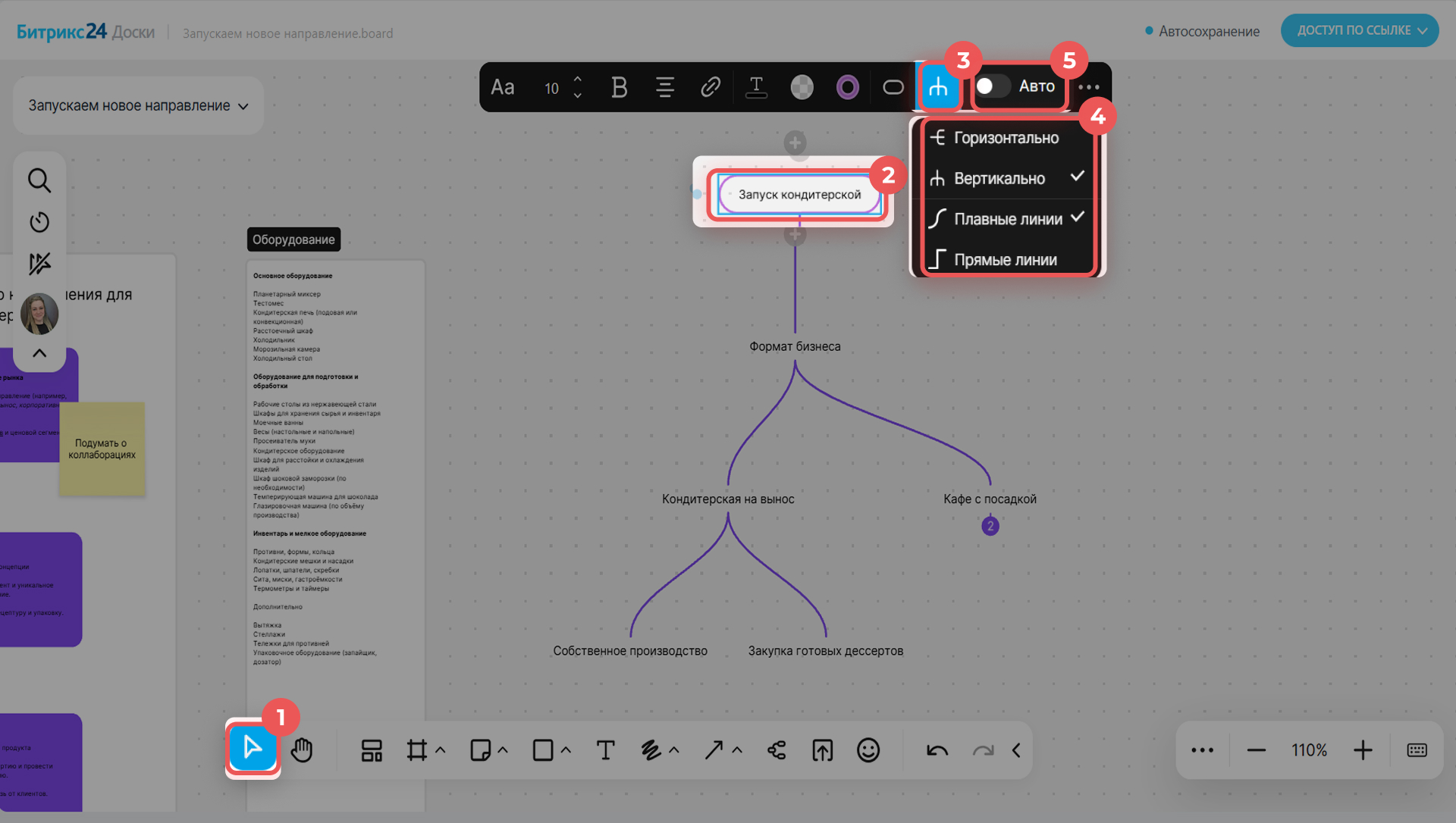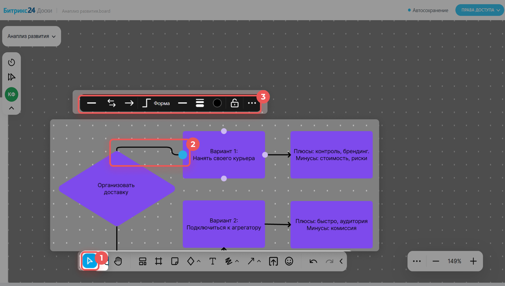 - Все изменения сохраняются автоматически: участники видят обновления в реальном времени и могут оставлять комментарии прямо на доске.