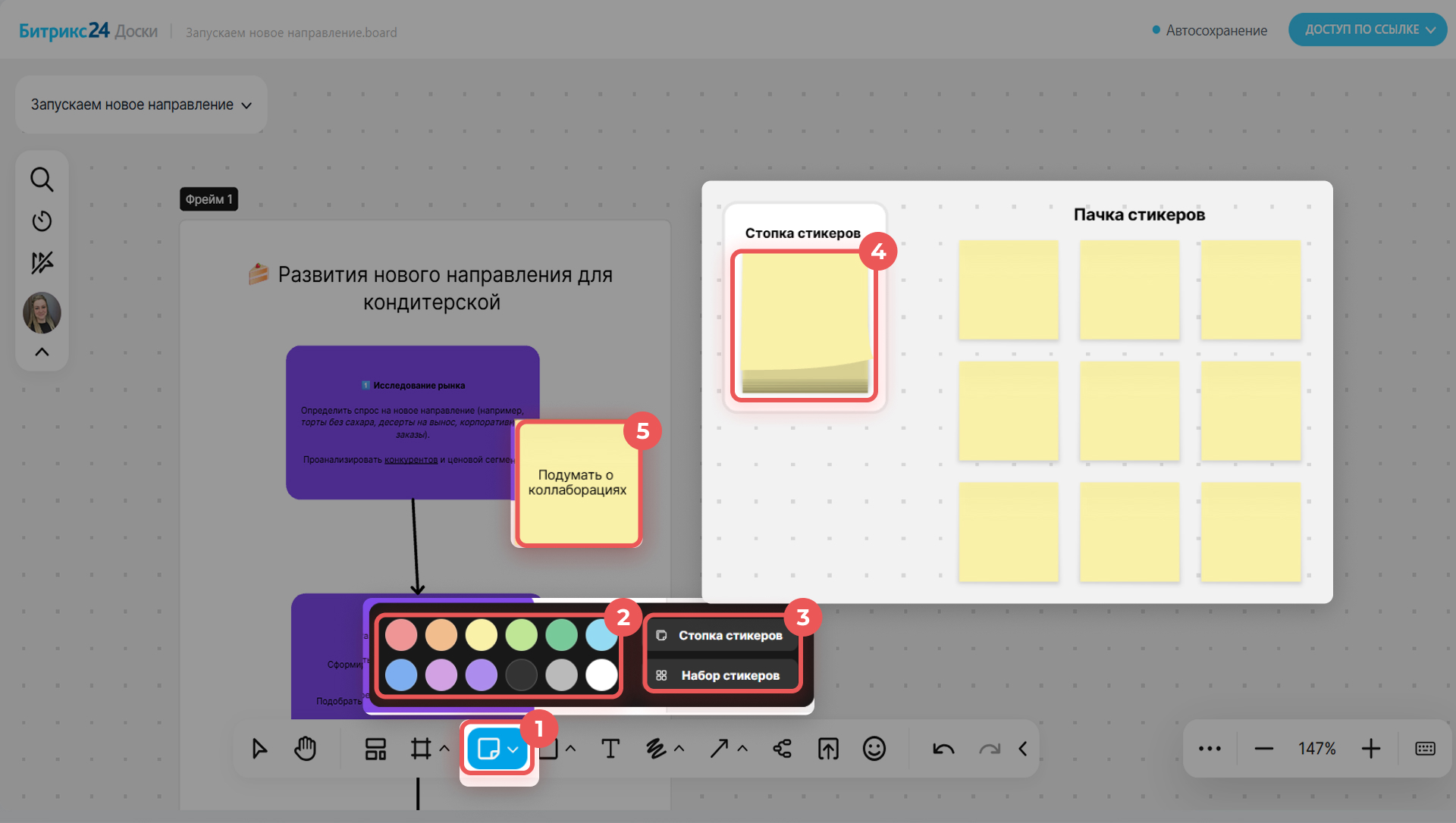 - Стопка стикеров — набор с неограниченным количеством стикеров. Подходит, если нужно добавить много заметок в одной области доски.