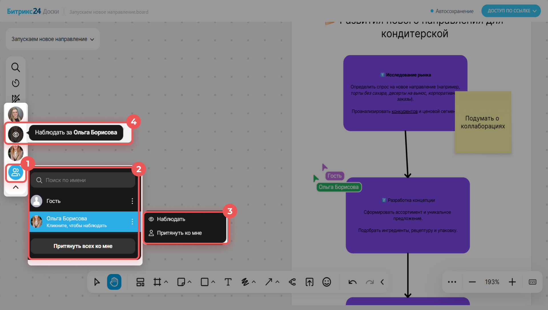 - Наблюдать — автоматически перемещает доску на вашем экране к участку, над которым работает пользователь, и адаптирует ее масштаб.
