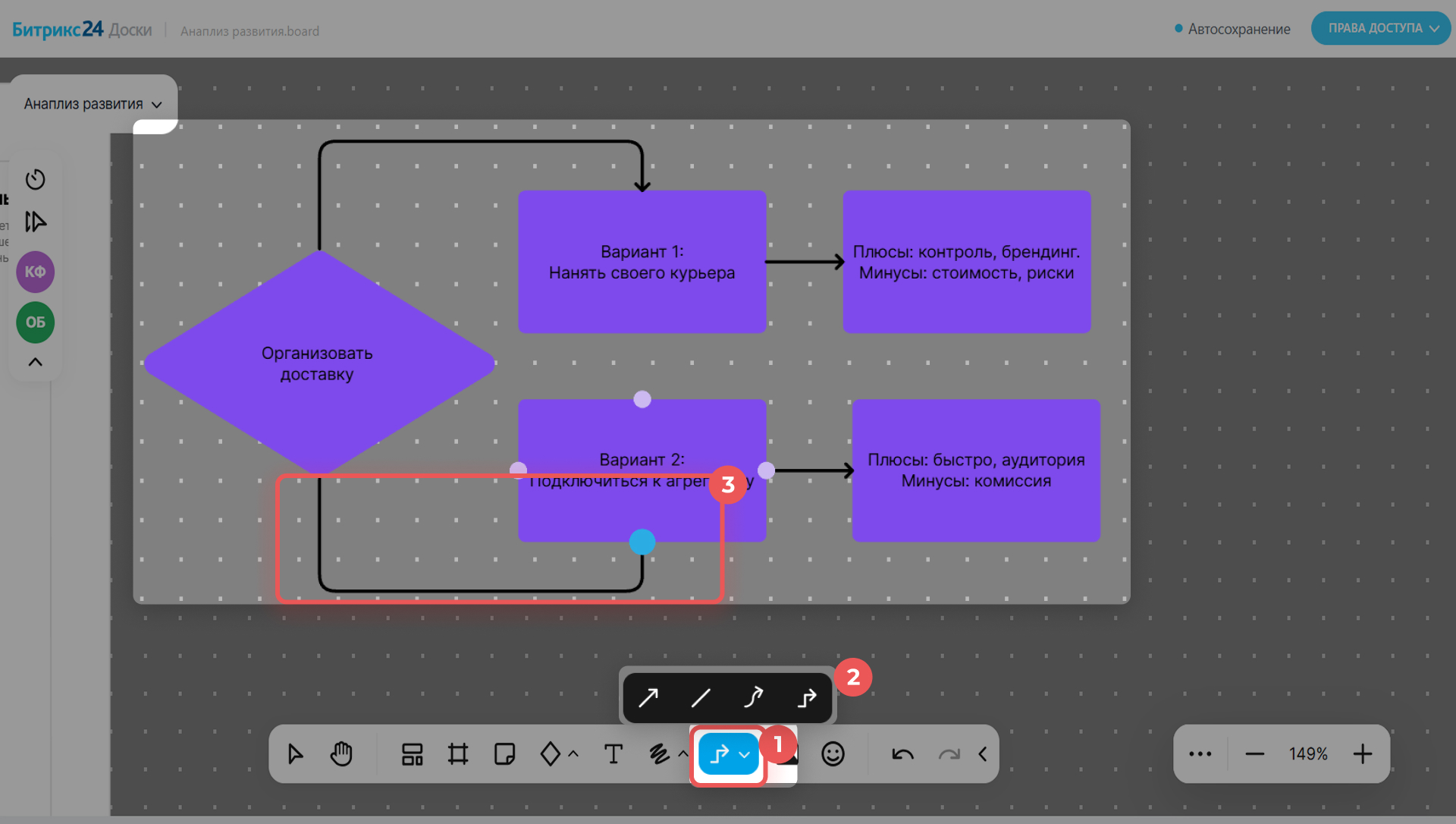 Стрелка — соединить объекты на доске. Можно использовать разные типы стрелок, чтобы показать связи между элементами или визуализировать последовательность шагов.