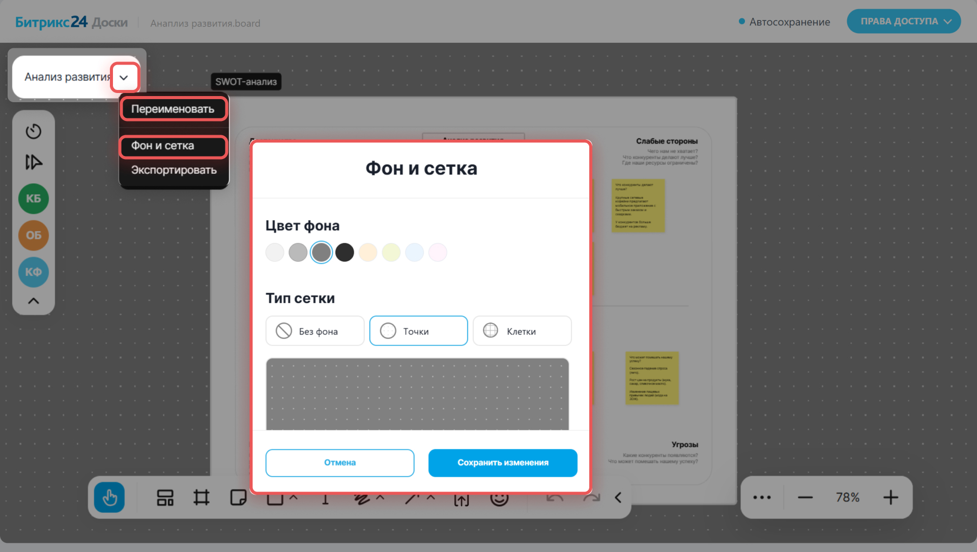 - Фон и сетка — настройте оформление доски. Выберите цвет фона и тип сетки: точки, клетка или удалите разметку.
