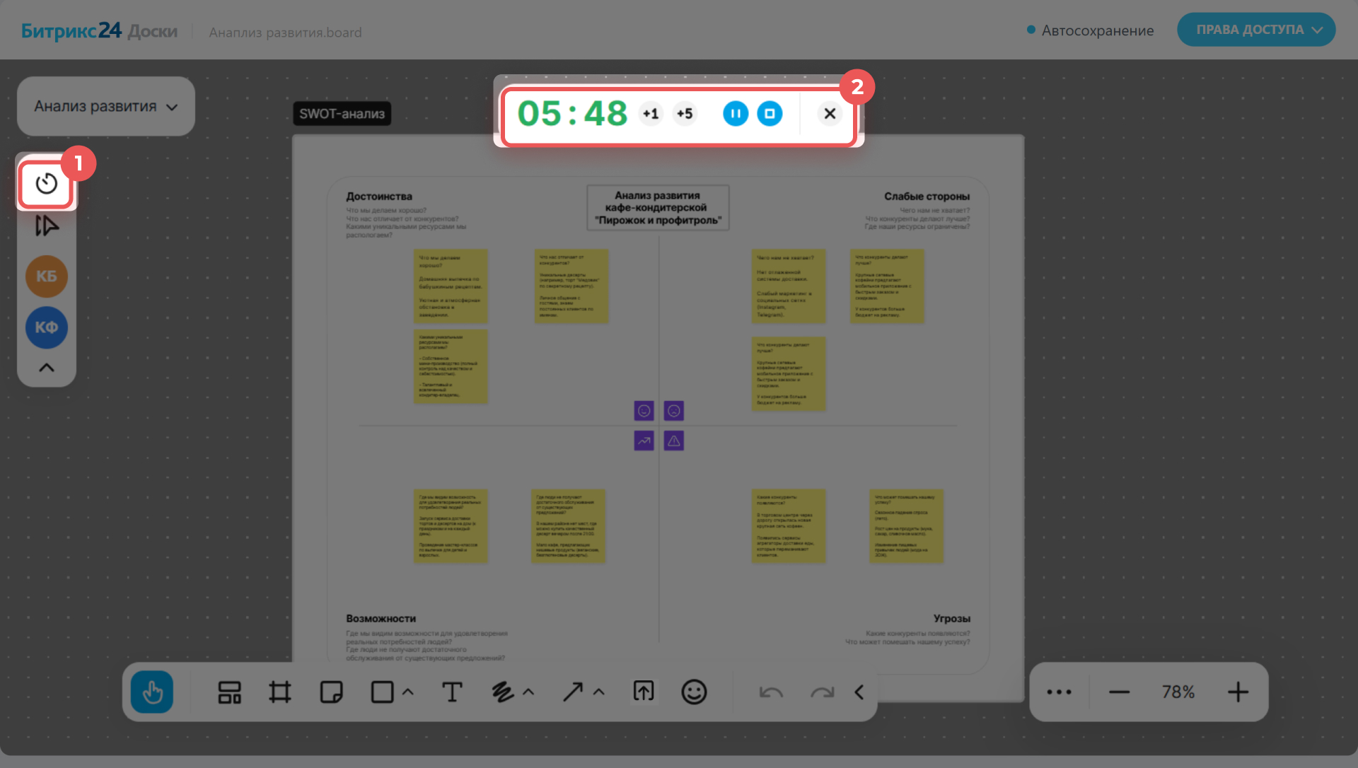 Таймер — помогает команде соблюдать регламент и сохранять фокус на содержании доски. Например, во время презентации проекта или обсуждения идей. Запущенный таймер виден всем, кто в данный момент работает над доской.