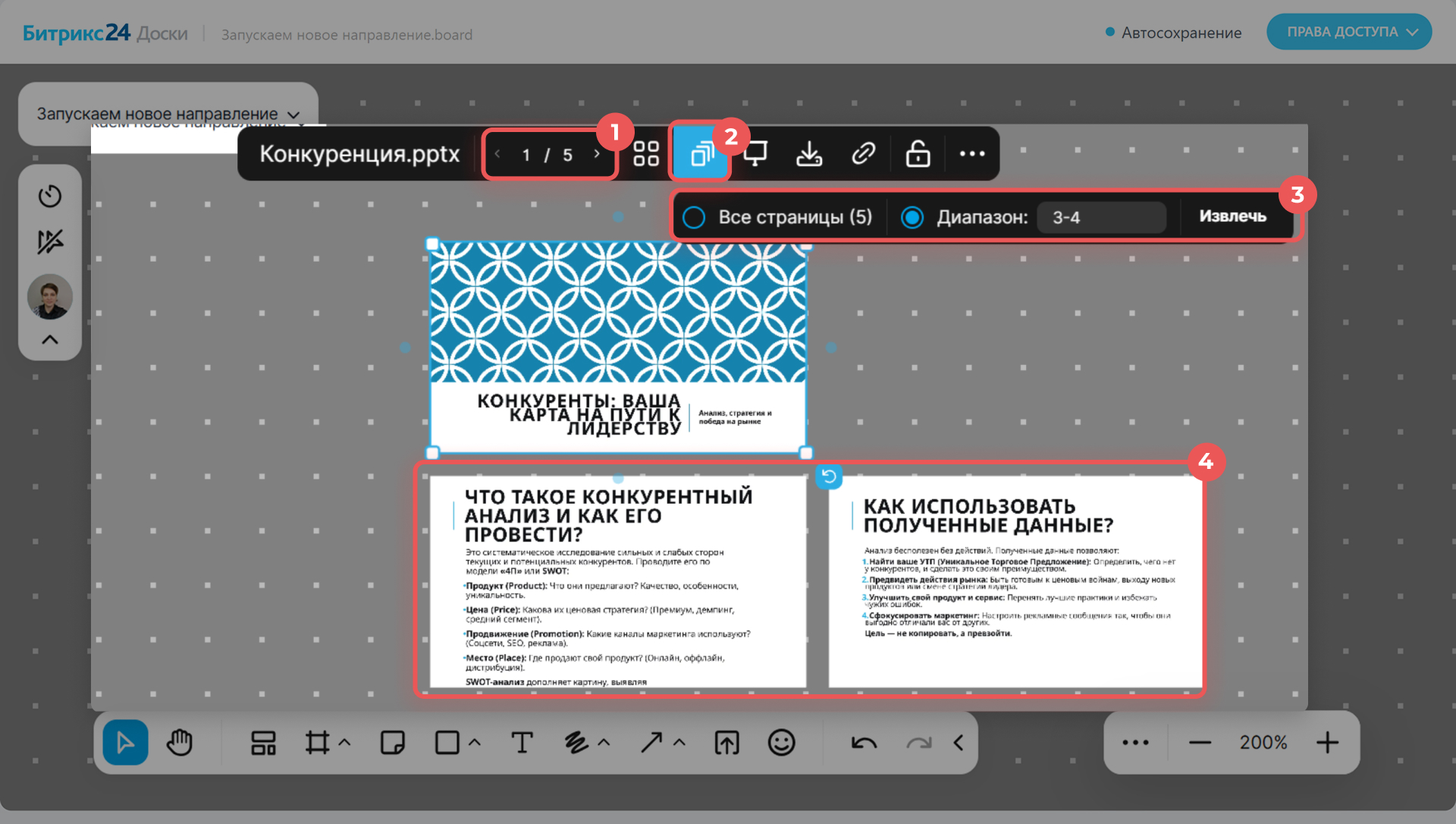 - извлекать все страницы или отдельные диапазоны — выбранные страницы добавятся на доску в виде отдельных файлов,