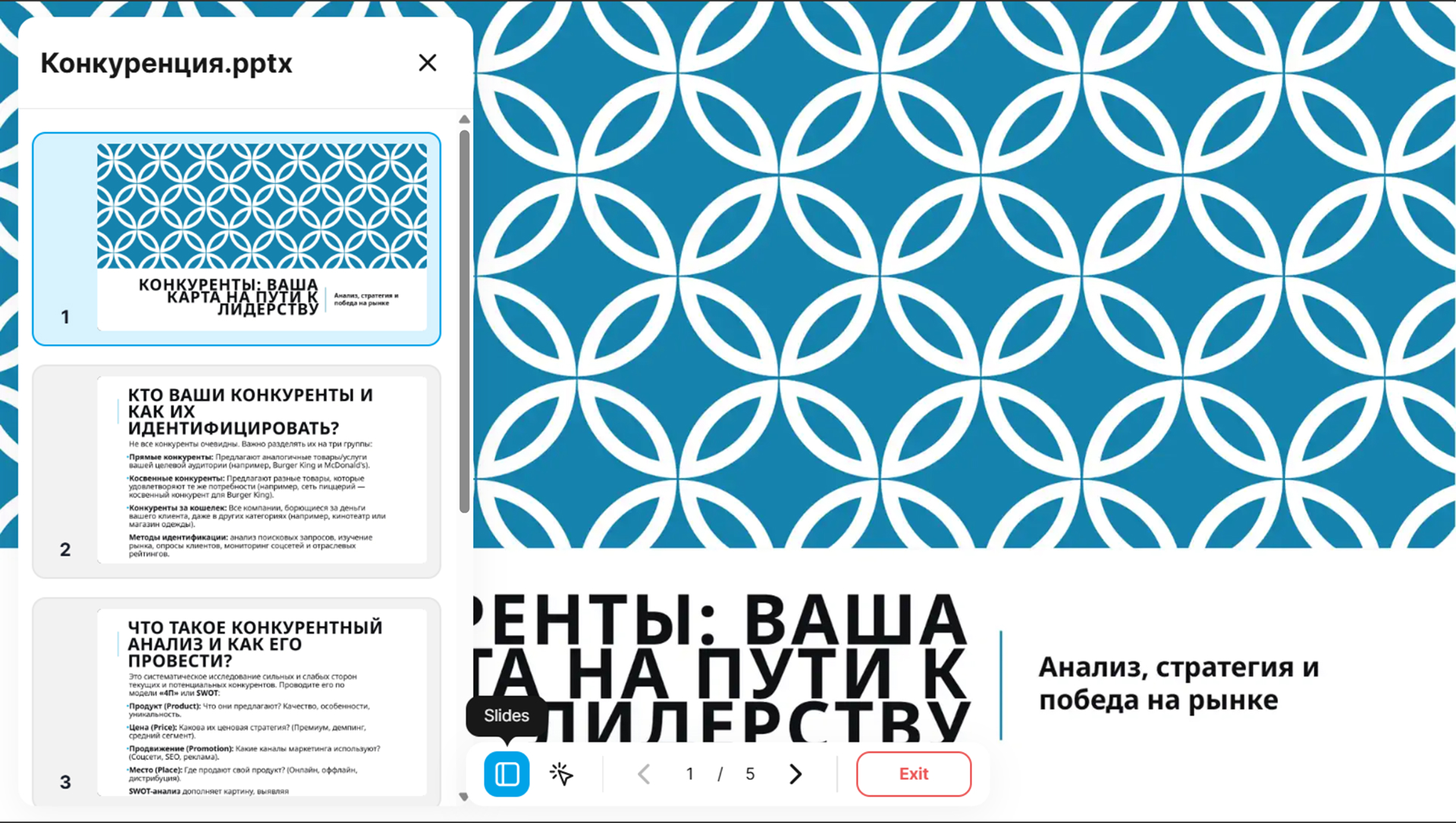 - включить режим презентации — развернуть документ на весь экран, просматривать слайды, использовать указку.