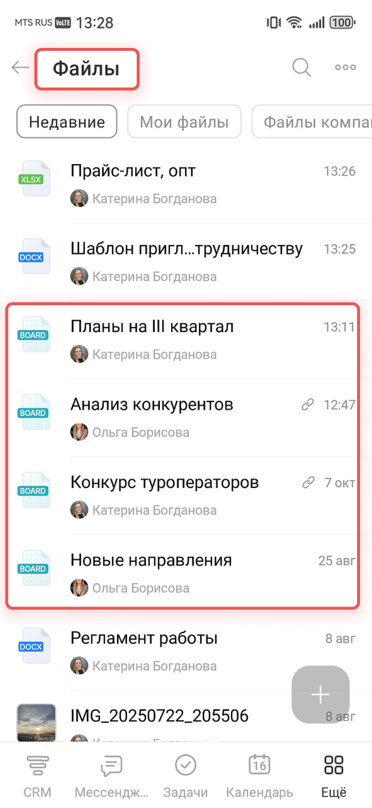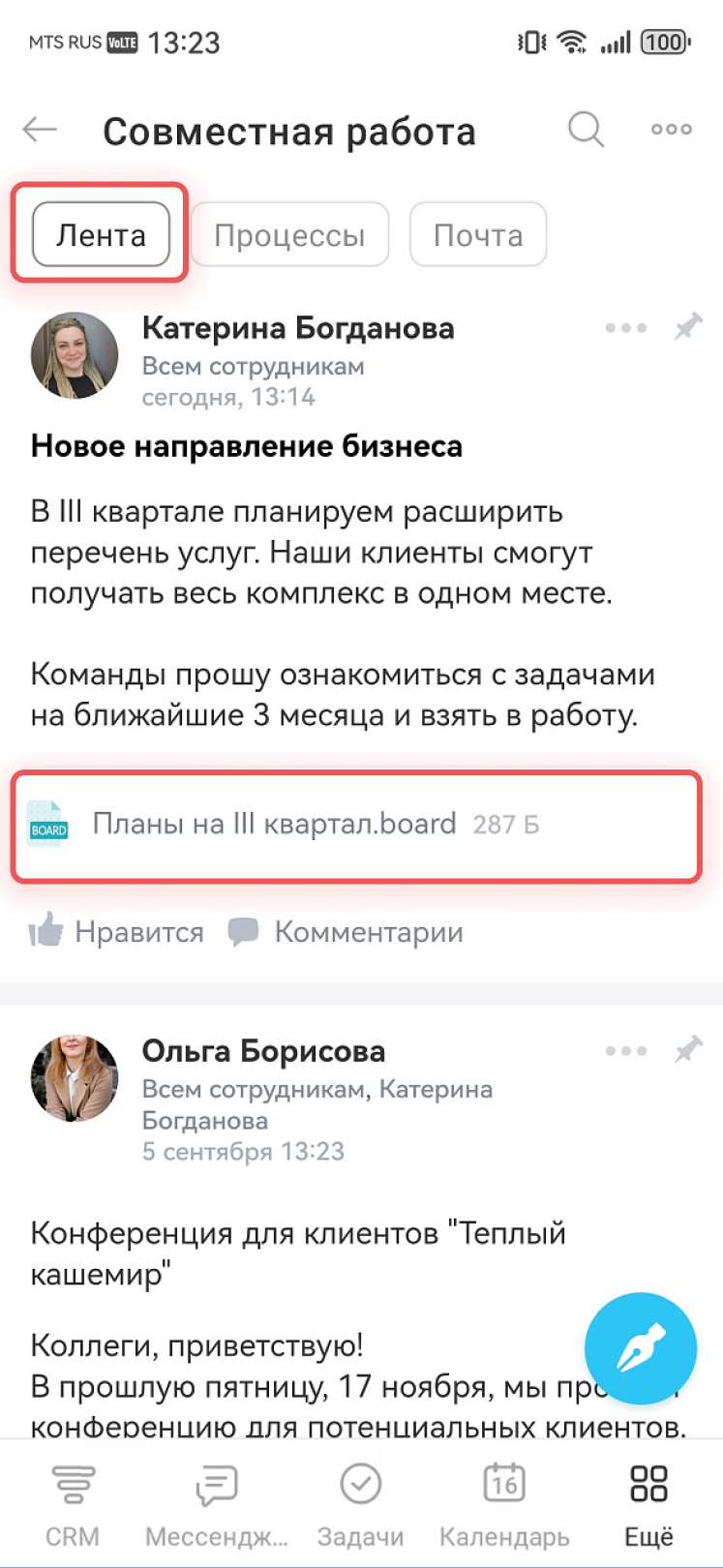 - В мобильном приложении Битрикс24 можно работать с доской так же, как на компьютере.