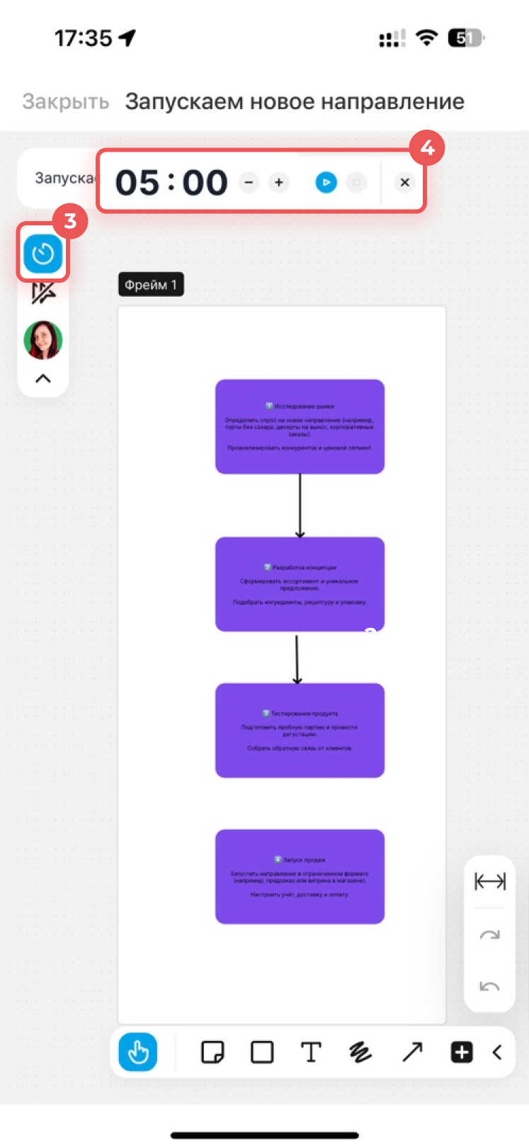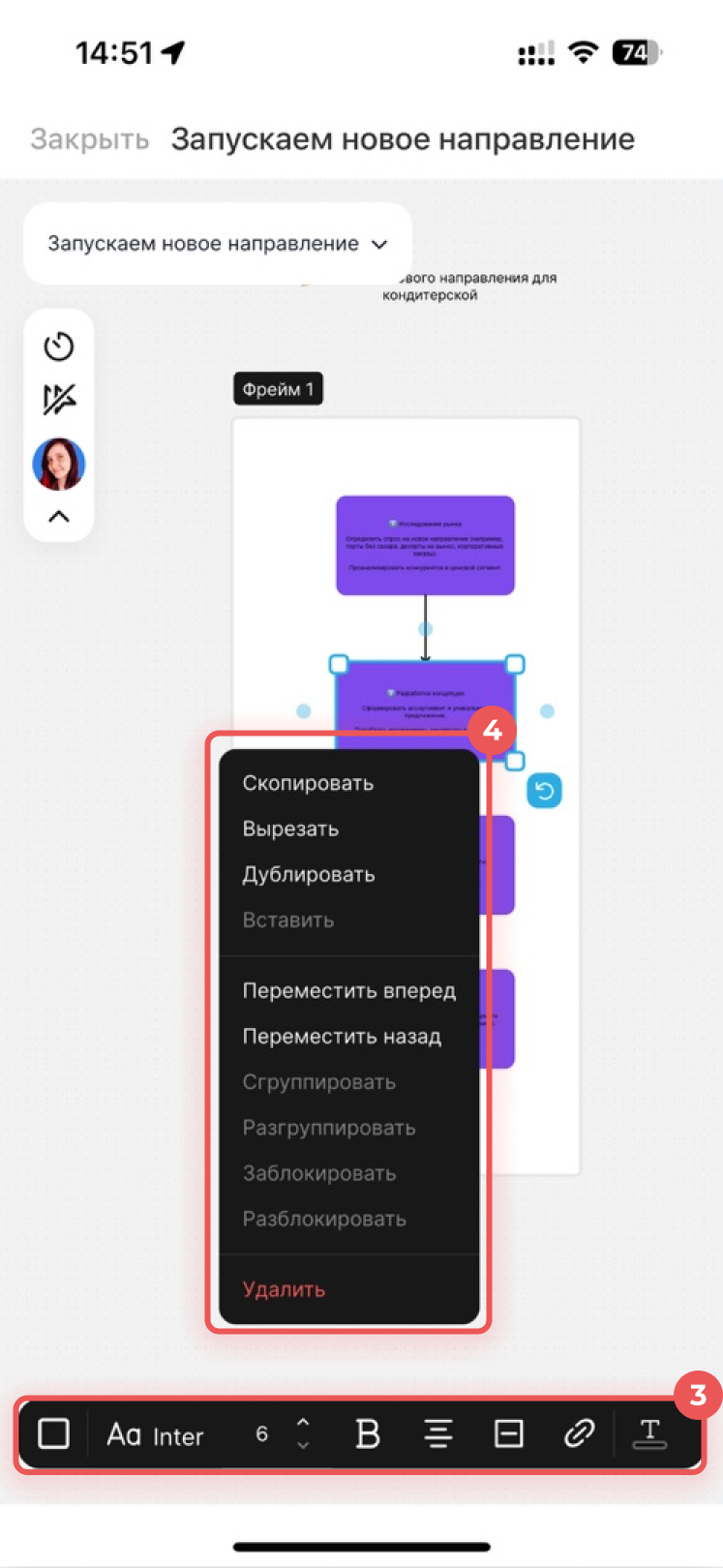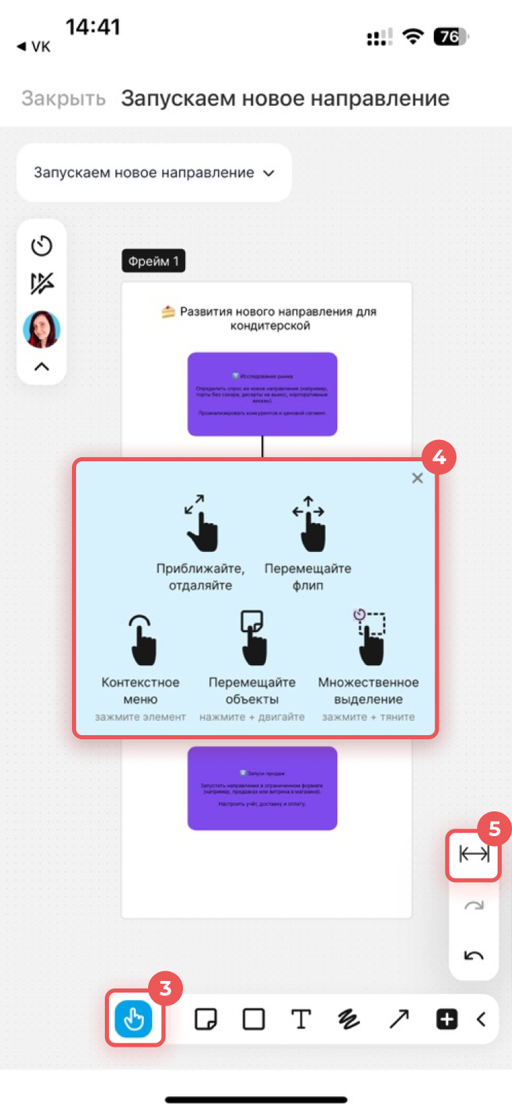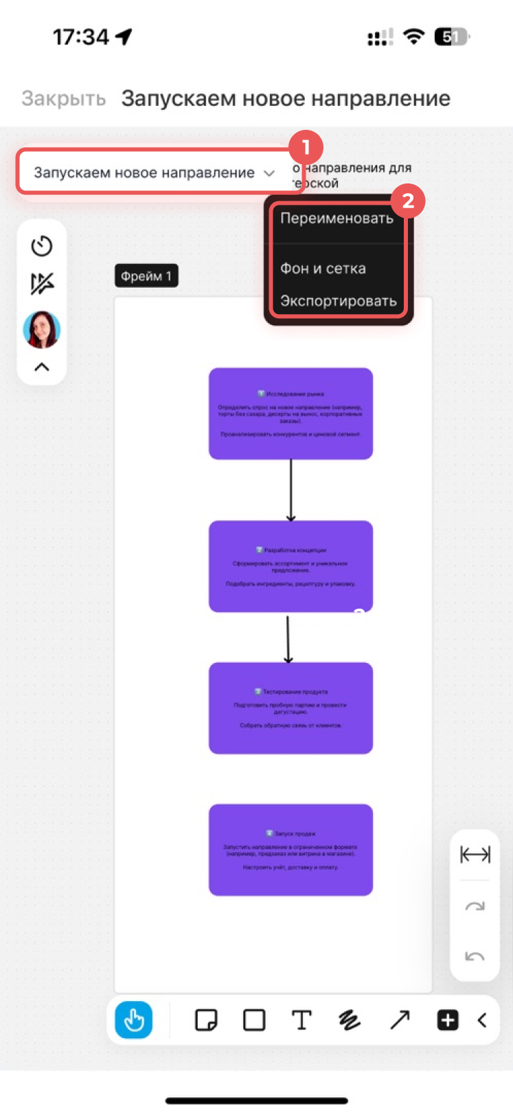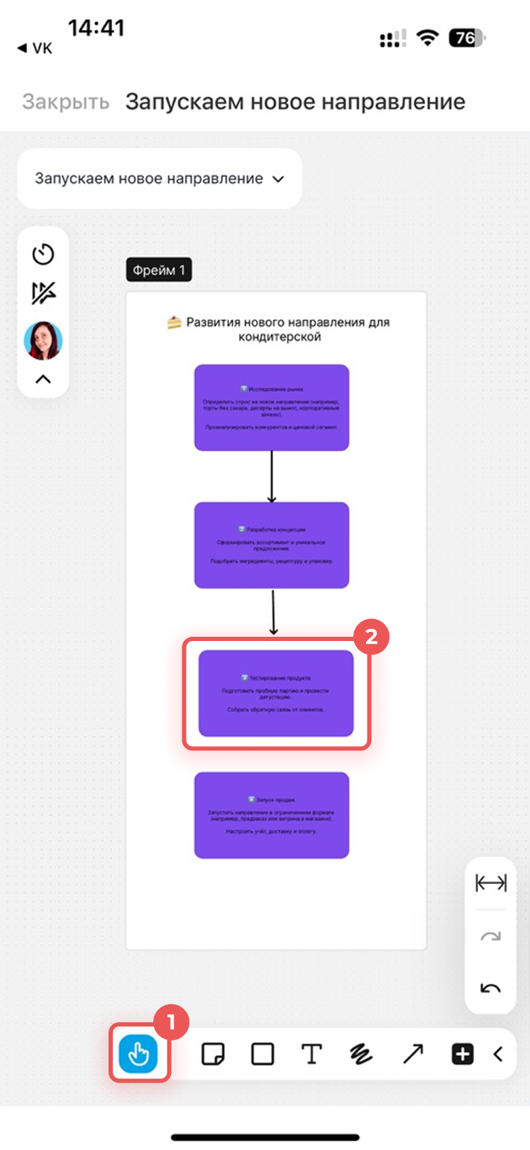 В мобильном приложении вы можете работать над доской так же, как на компьютере: создавать блок-схемы, добавлять надписи, эмодзи и стикеры и так далее. Панель инструментов находится внизу экрана — нажмите ➕, чтобы ее развернуть.