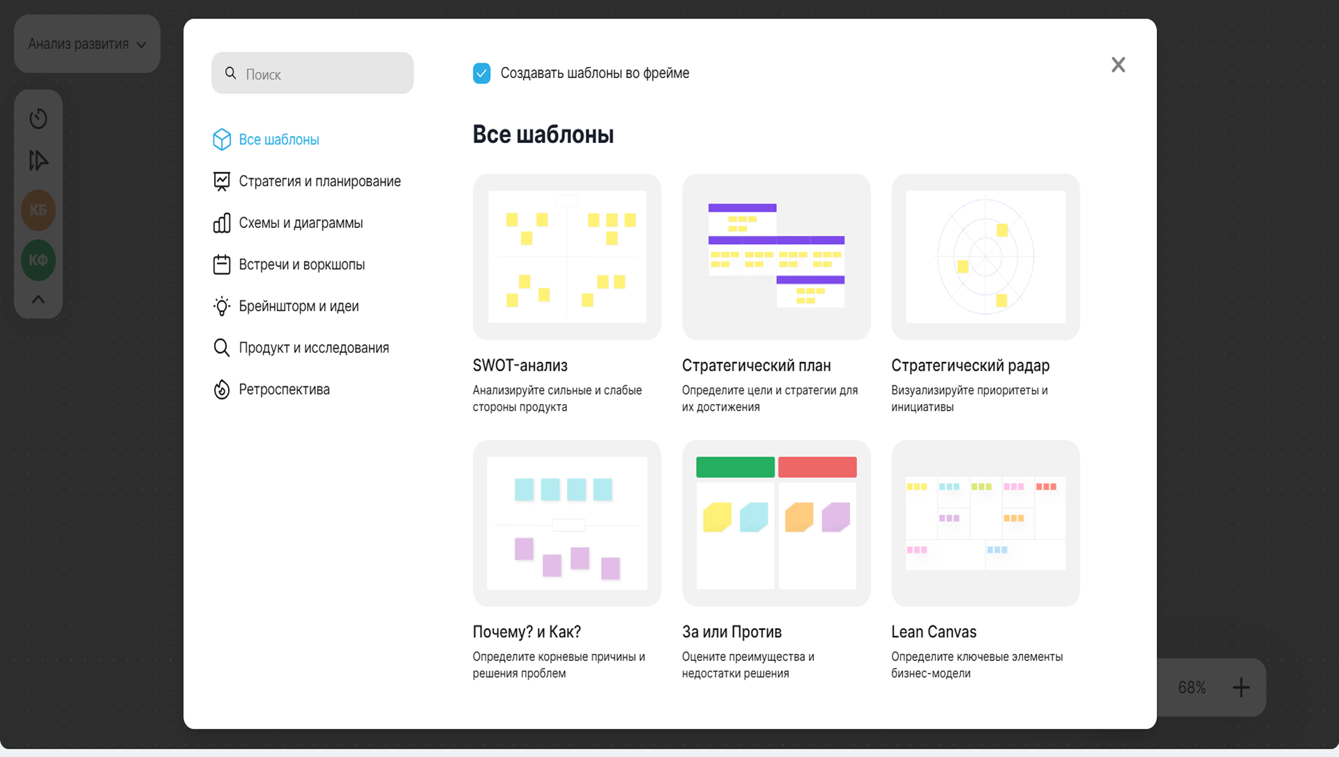 Шаблоны — добавить готовые наборы элементов для планов, схем, аналитики и так далее.