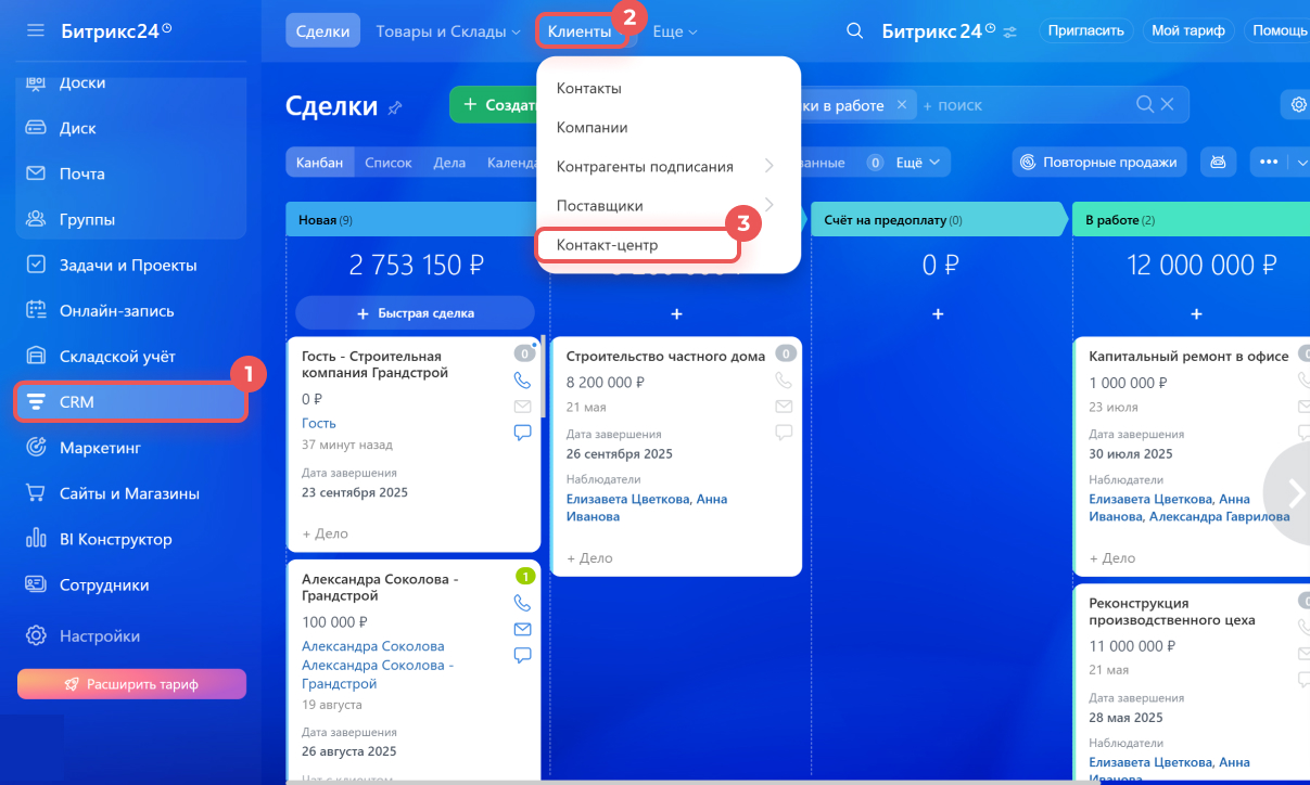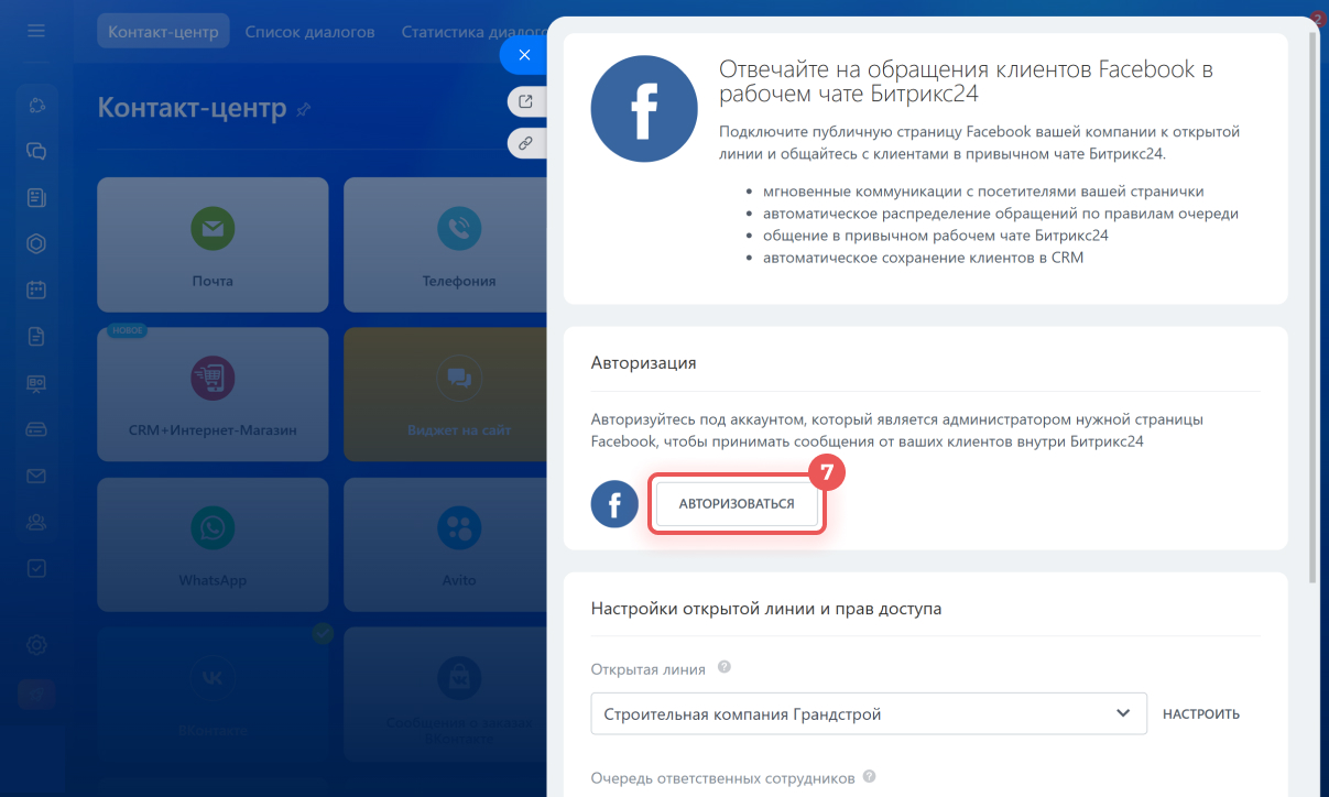 1–3. Откройте CRM > Клиенты > Контакт-центр > Facebook: Сообщения* или Instagram* Direct*.