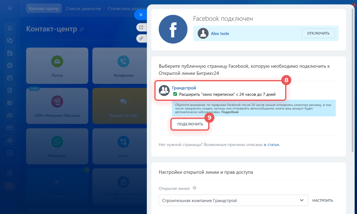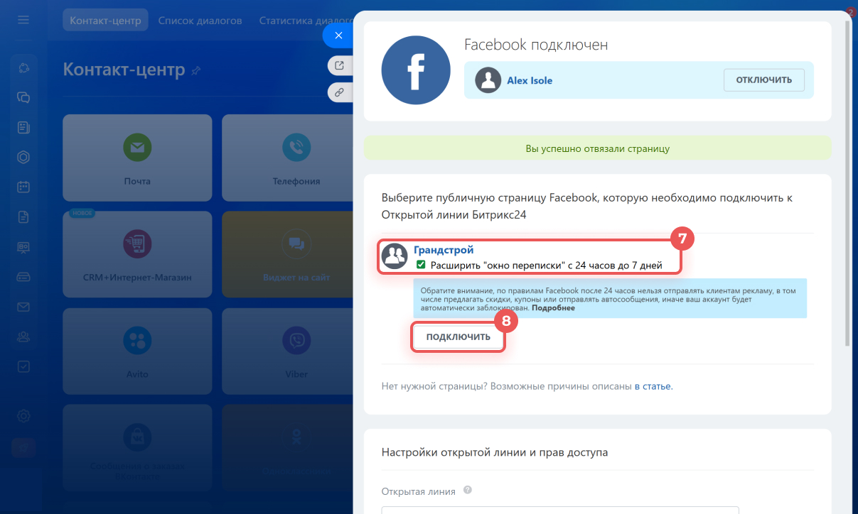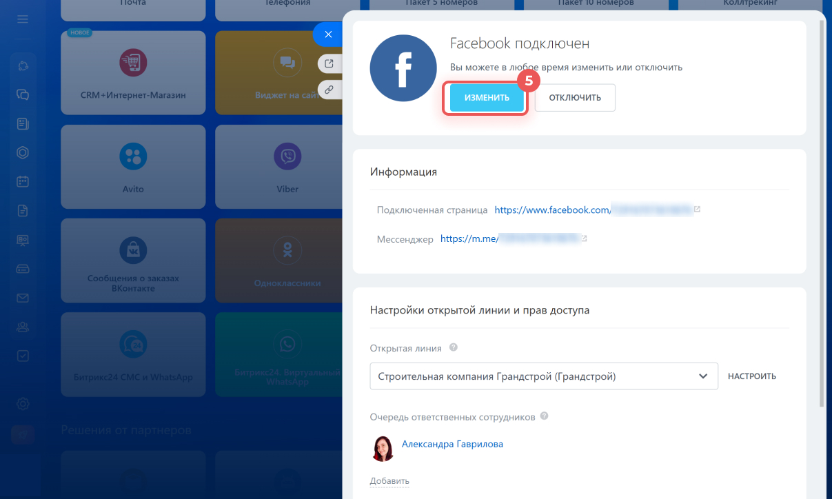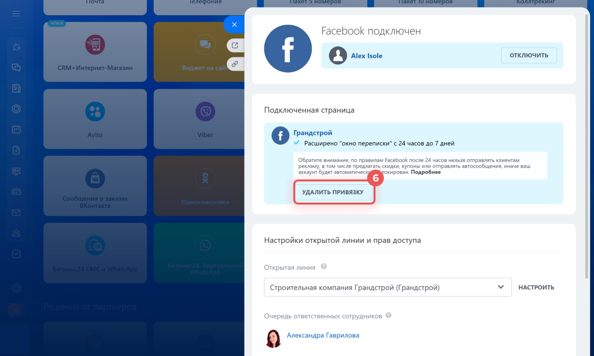 Если канал уже подключен, время на ответ можно изменить. Для этого отключите публичную страницу Facebook* или аккаунт Instagram* от Битрикс24 и подключите их заново.