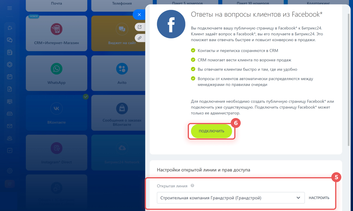 - Если канал уже подключен, опцию можно включить или отключить. Для этого отключите публичную страницу Facebook* или аккаунт Instagram* от Битрикс24 и подключите их заново.