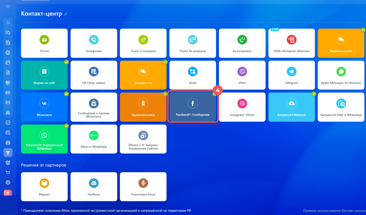 1–4. Перейдите в CRM > Клиенты > Контакт-центр > Facebook: Сообщения* или Instagram* Direct.
