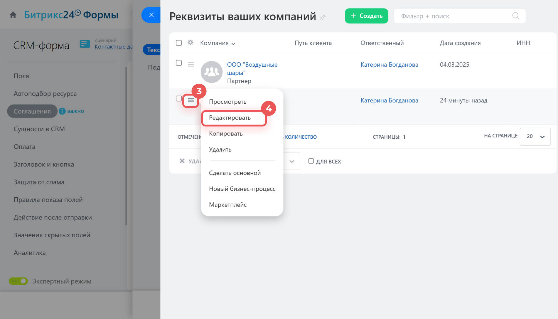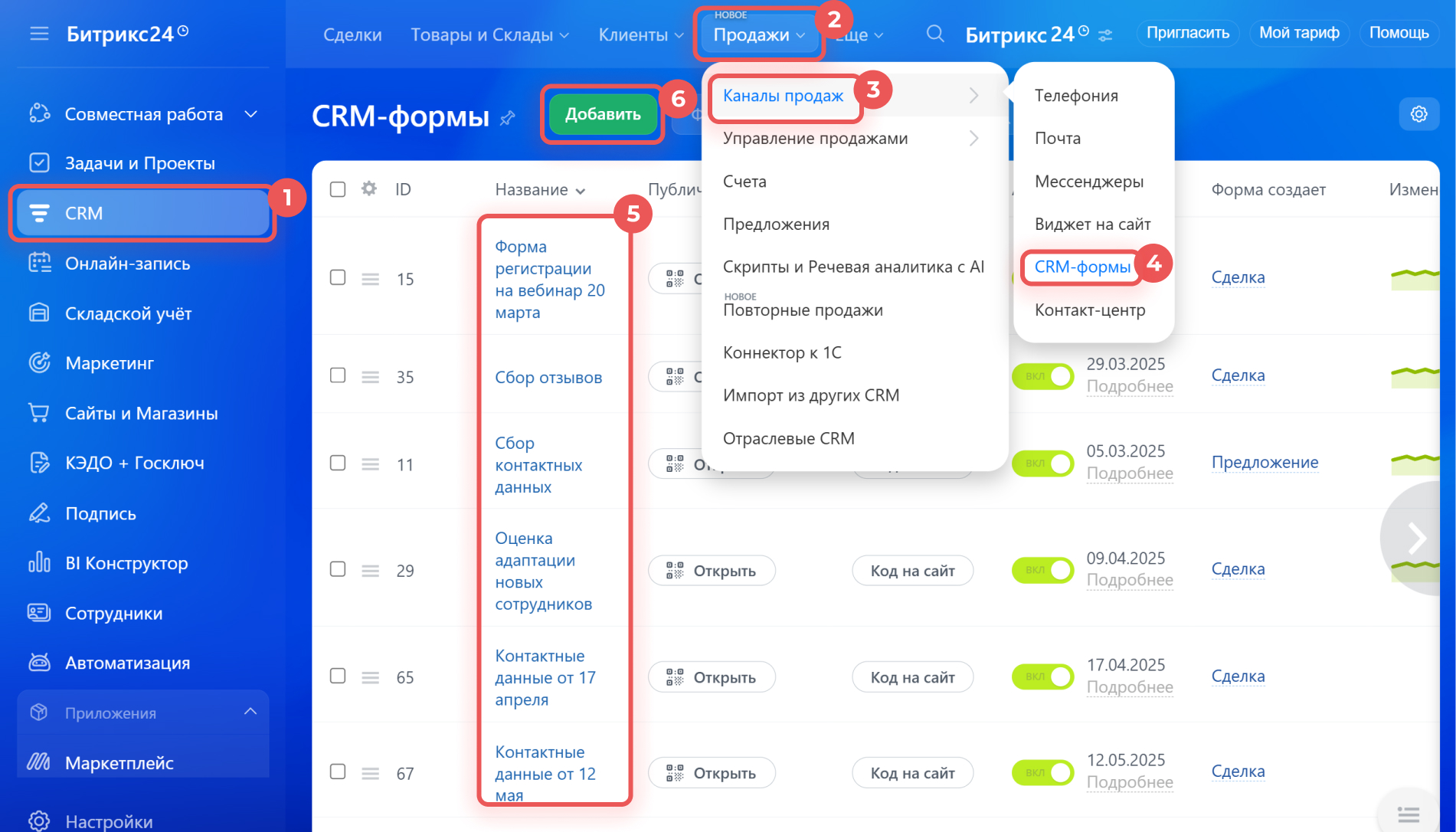 1–4. Перейдите в раздел CRM > Продажи > Каналы продаж > CRM-формы.