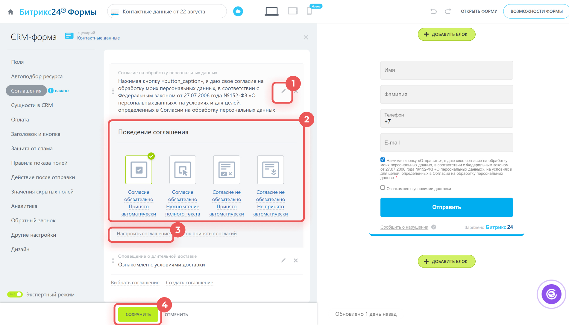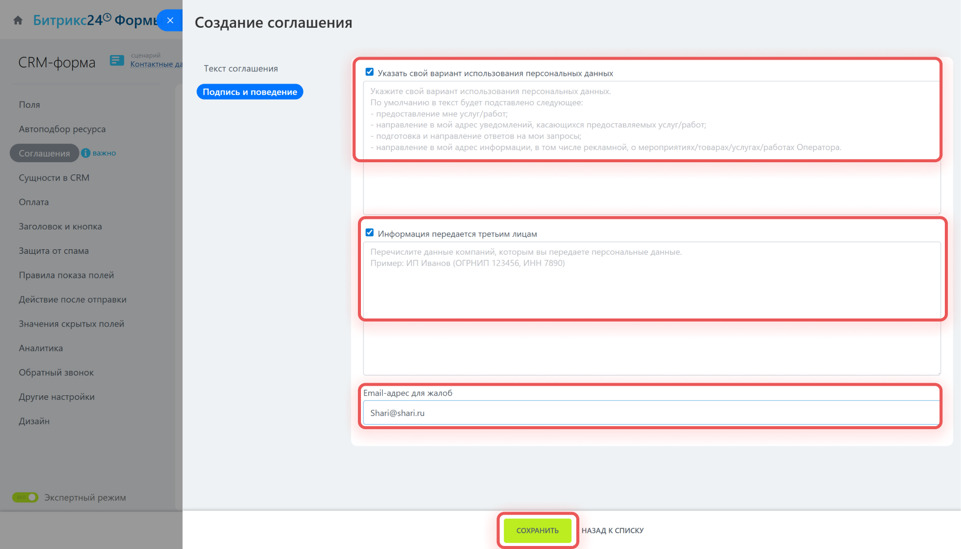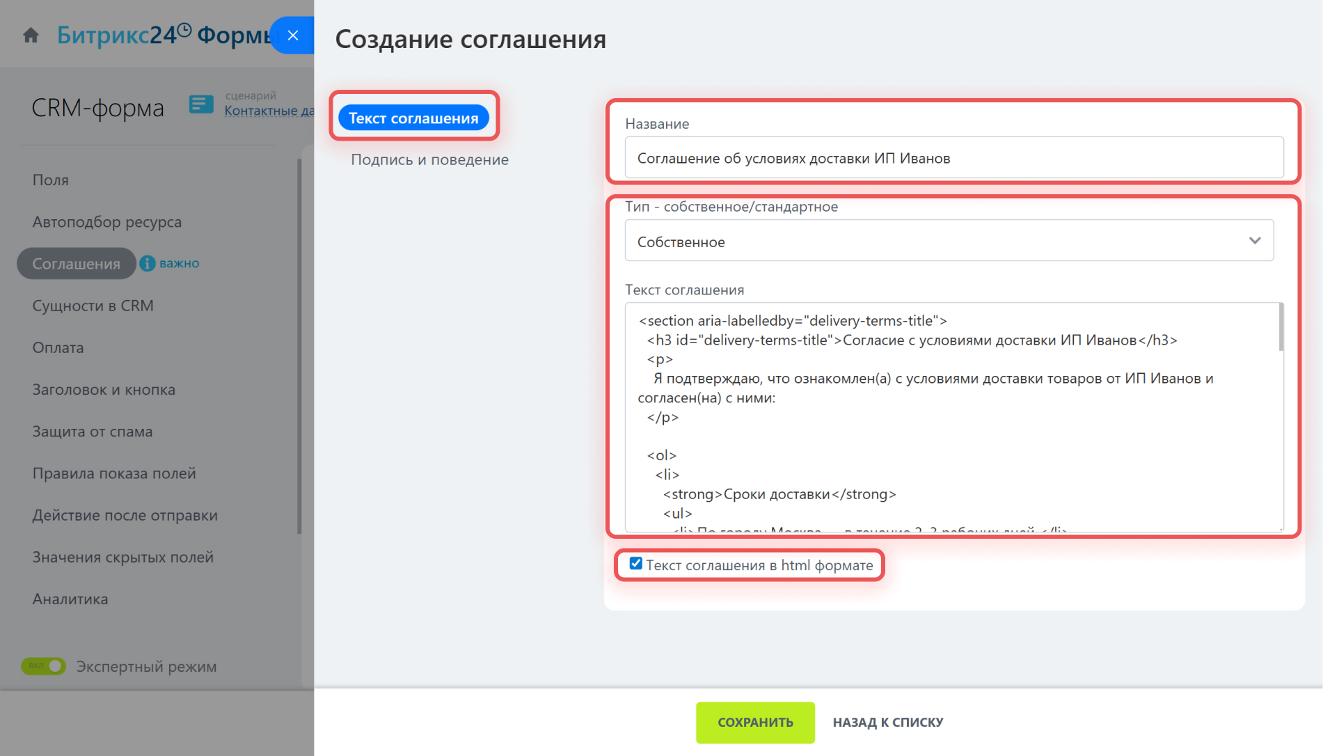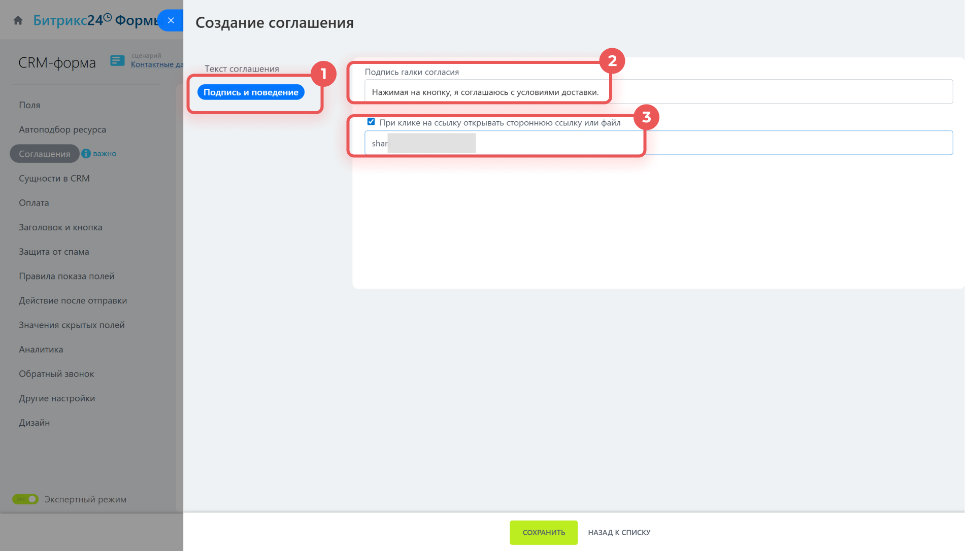 В форму можно добавить разные соглашения, которые оповестят клиентов об условиях доставки, правилах акции и других важных деталях. Когда клиент прочитает текст и подтвердит согласие, информация об этом и данные из формы сохранятся в CRM.