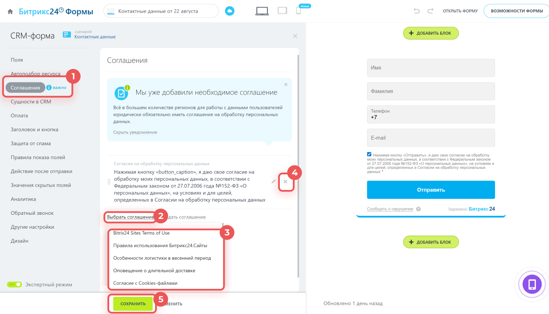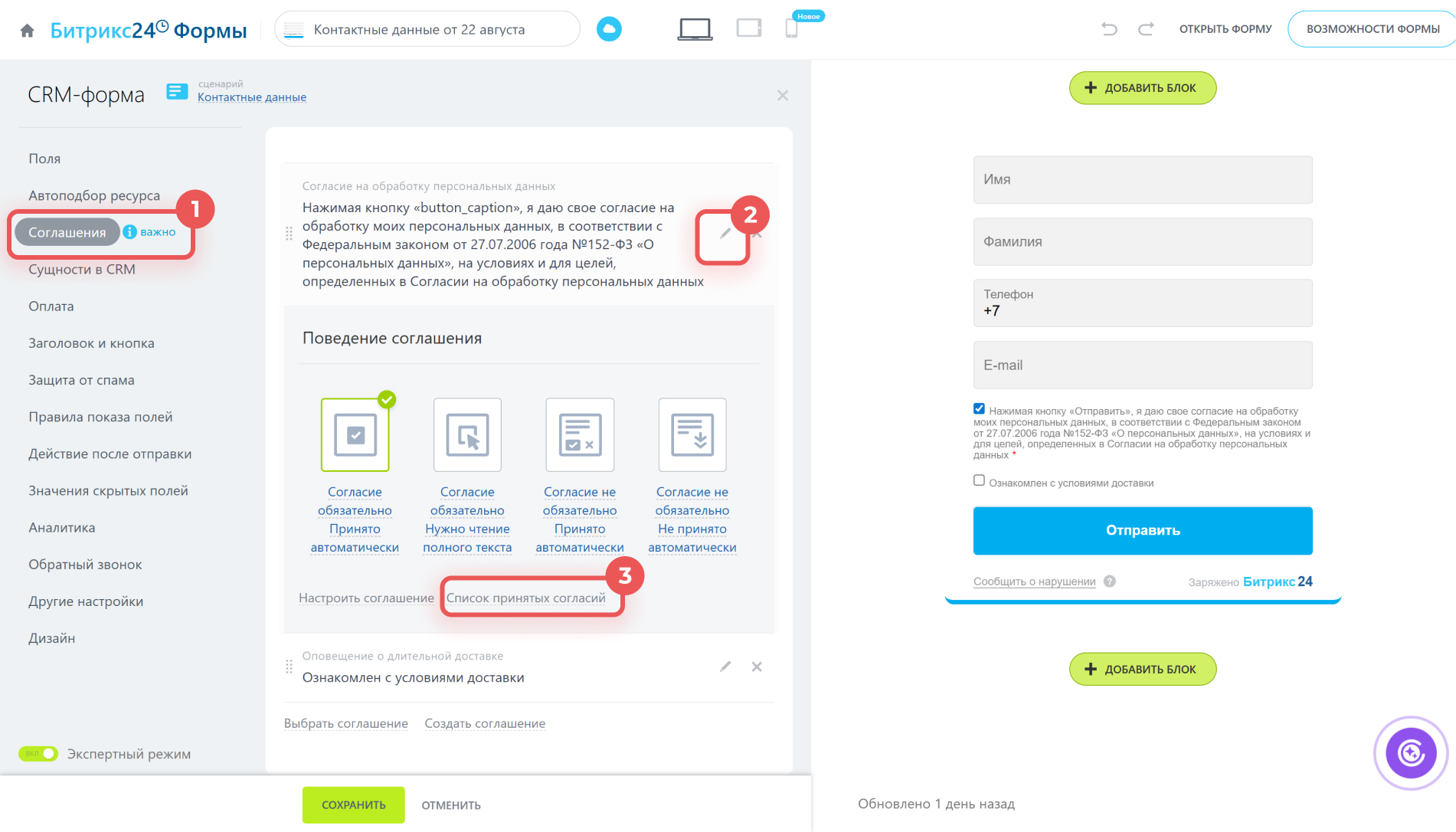 - Через CRM‑формы Битрикс24 можно собирать согласия пользователей: на обработку персональных данных, получение рассылок, участие в акции и другие. Это помогает компаниям работать в соответствии с законом, а клиентам — защищать свои интересы.