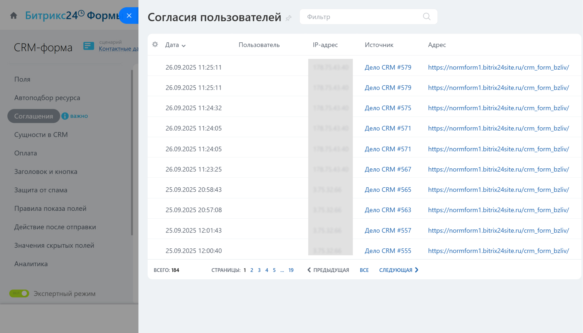 - В списке согласий отображаются дата, IP клиента, источник, страница, на которой клиент подтвердил свое согласие. Удалить информацию из списка нельзя.