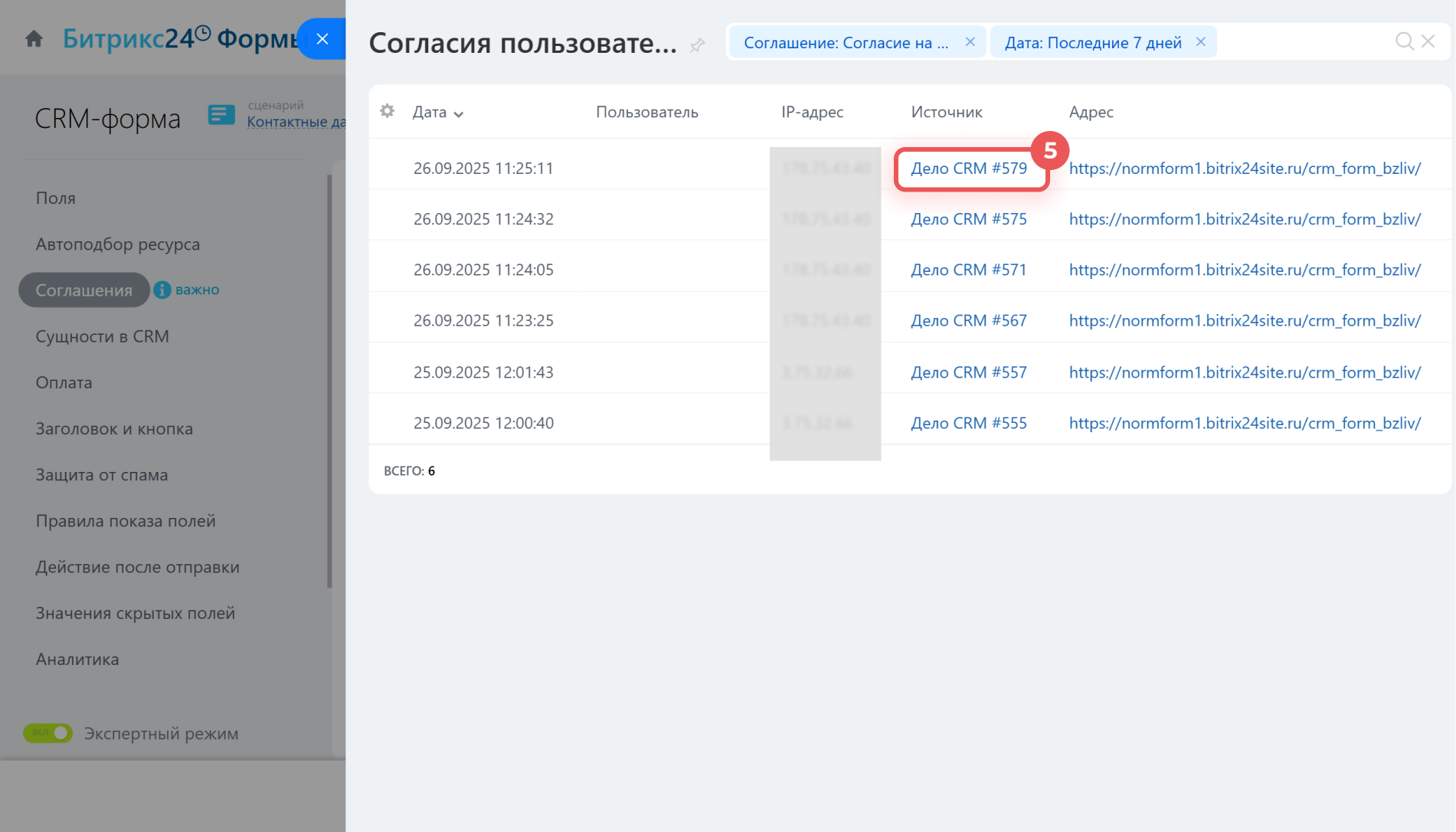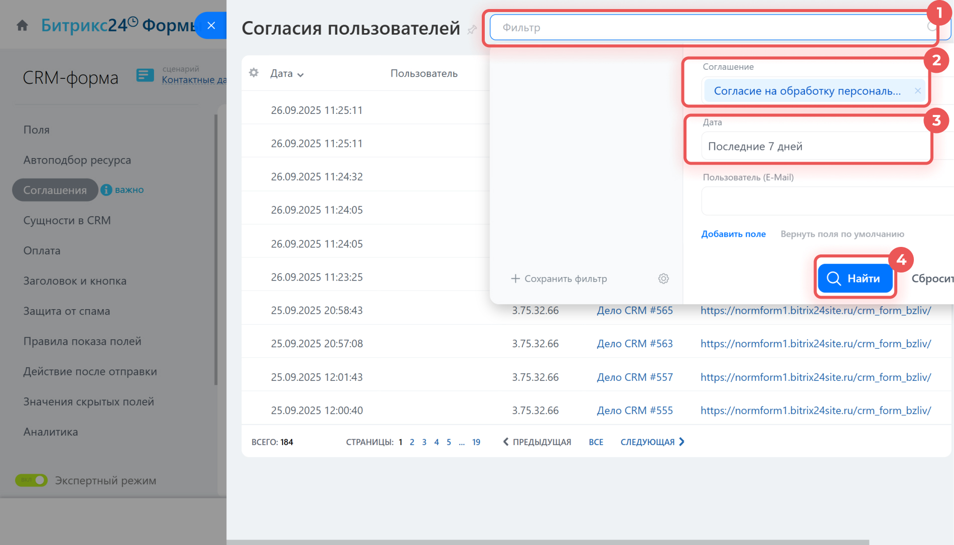 - Для поиска согласий по параметрам, используйте фильтр. Чтобы посмотреть данные клиента, в списке согласий нажмите на элемент CRM в поле Источник.