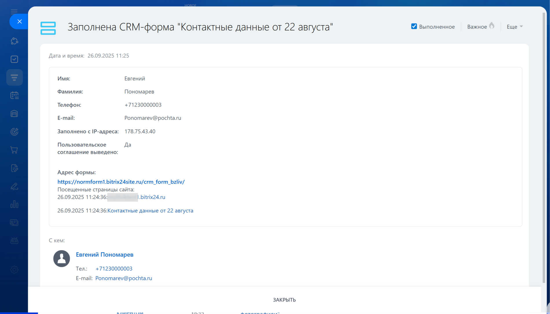 - Пользователь — заполняется, если согласие подтвердил сотрудник Битрикс24, участник коллабы или авторизованный клиент интернет‑магазина Битрикс24.