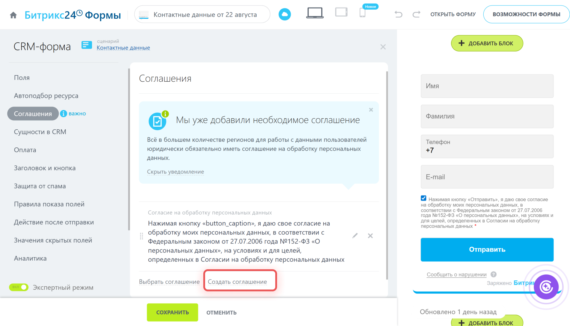- Вы можете использовать готовый шаблон согласия на обработку персональных данных или создать любое соглашение с нуля, настроить его поведение, изменить текст и название.