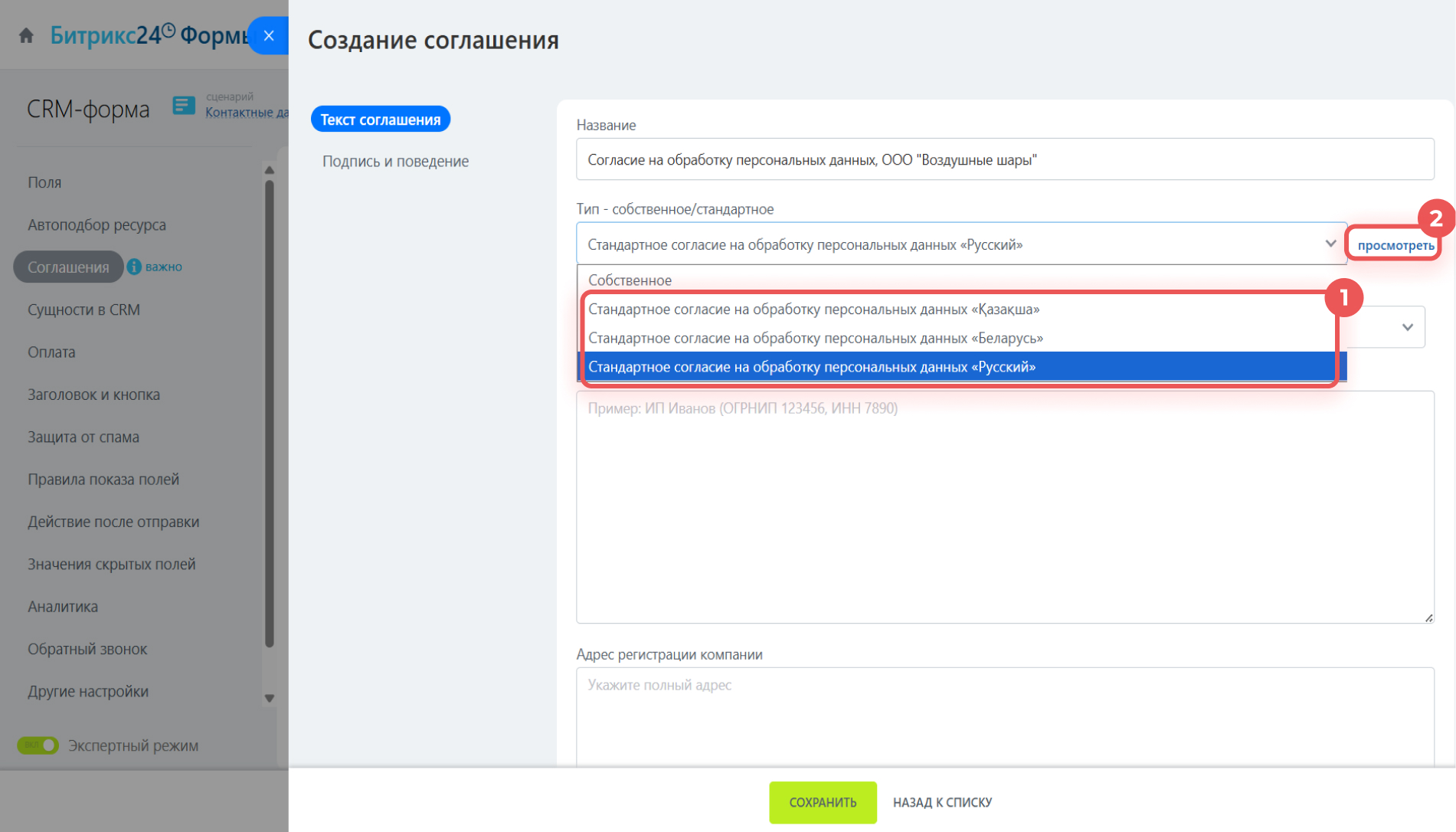 Название — укажите его так, чтобы легко находить нужное соглашение в списке. Например, добавьте тип согласия и название компании.
