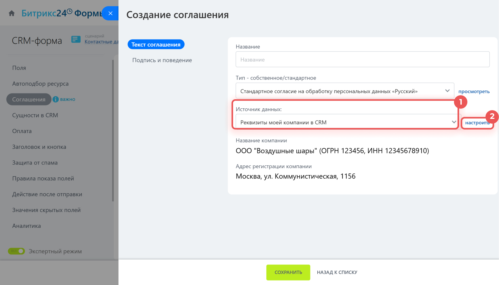1. В поле Источник данных выберите вариант Реквизиты моей компании в CRM. Если у вас несколько компаний, в текст соглашения подставятся реквизиты основной.
