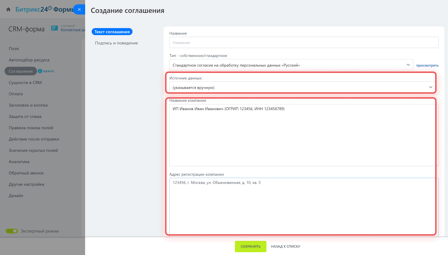 - Источник данных о принятом согласии: элемент CRM, сайт и так далее.