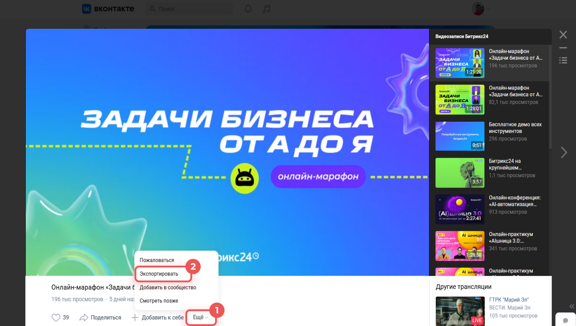 1–2. Откройте видео, которое хотите добавить на сайт и нажмите Еще > Экспортировать.