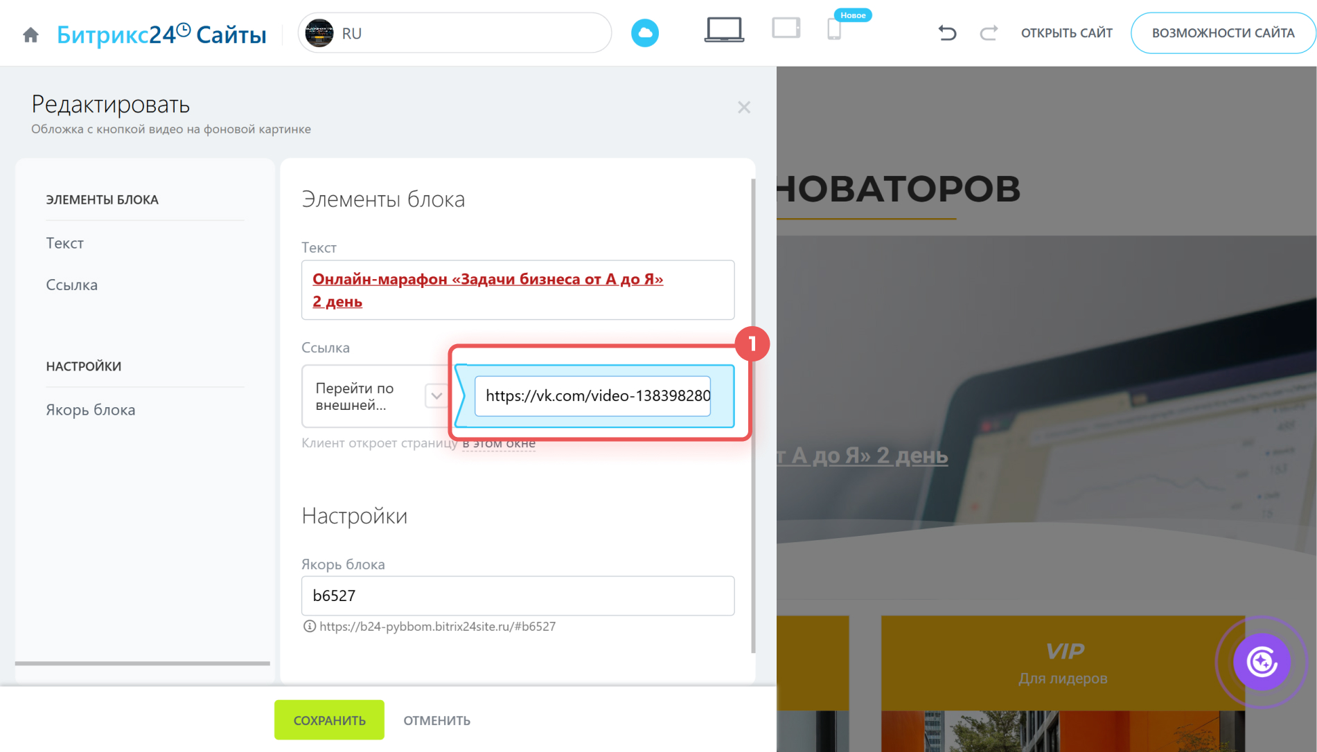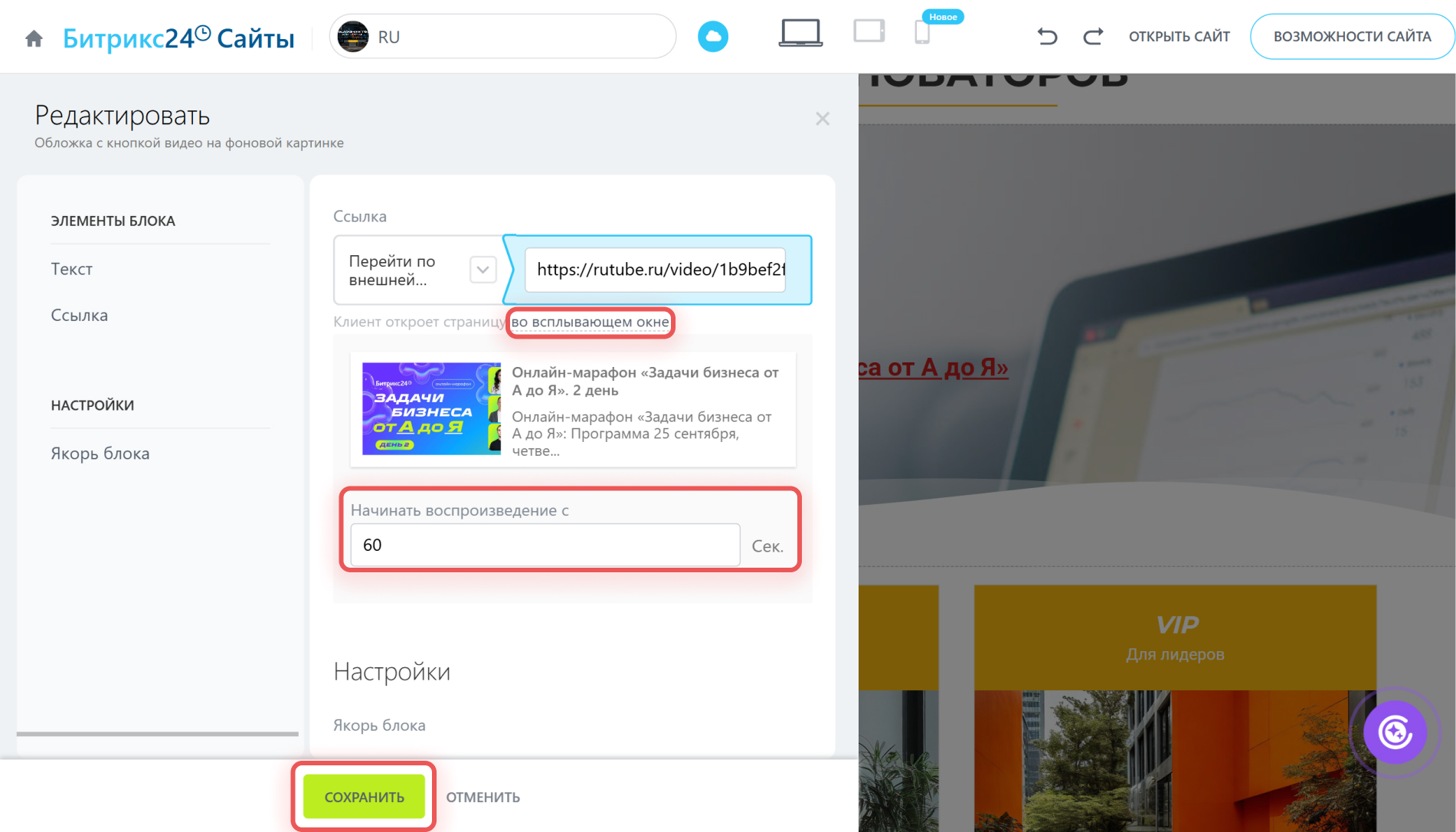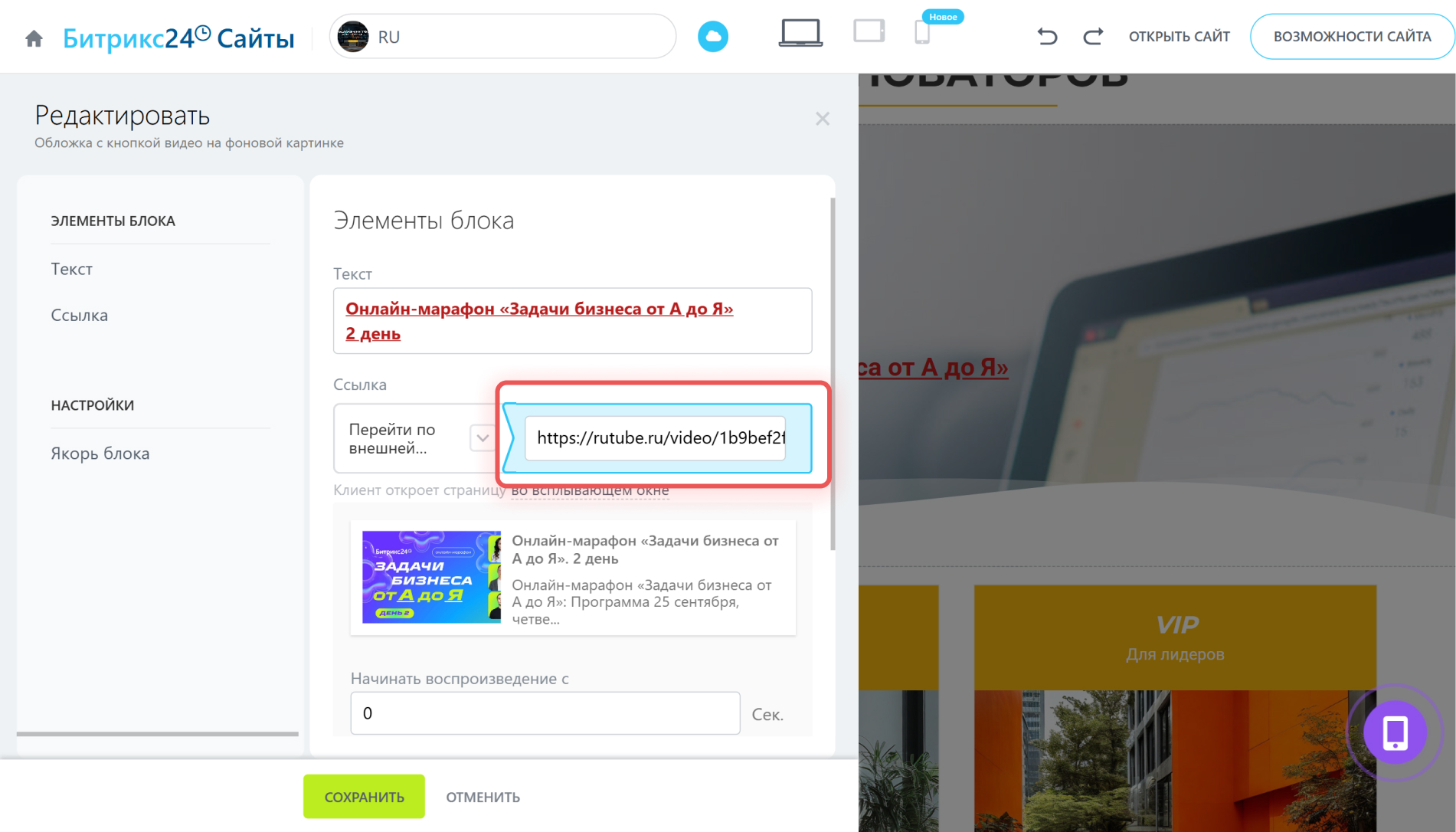 Сохраните изменения — правки на сайте опубликуются автоматически. Откройте сайт и проверьте, как отображается видео.