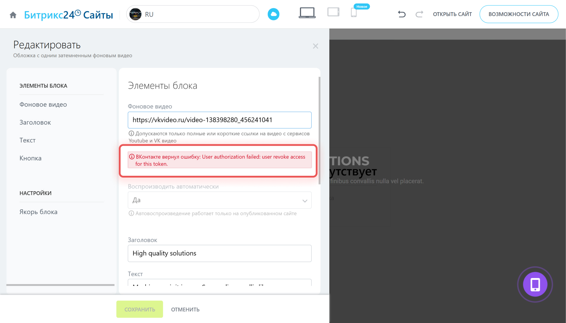 - Если возникает ошибка User authorization failed: invalid access_token, удалите блок с видео. Перейдите на сайт id.vk.com и отзовите доступ к VK ID для приложения Bitrix24. Вернитесь в ваш Битрикс24 и настройте блок с видео заново.