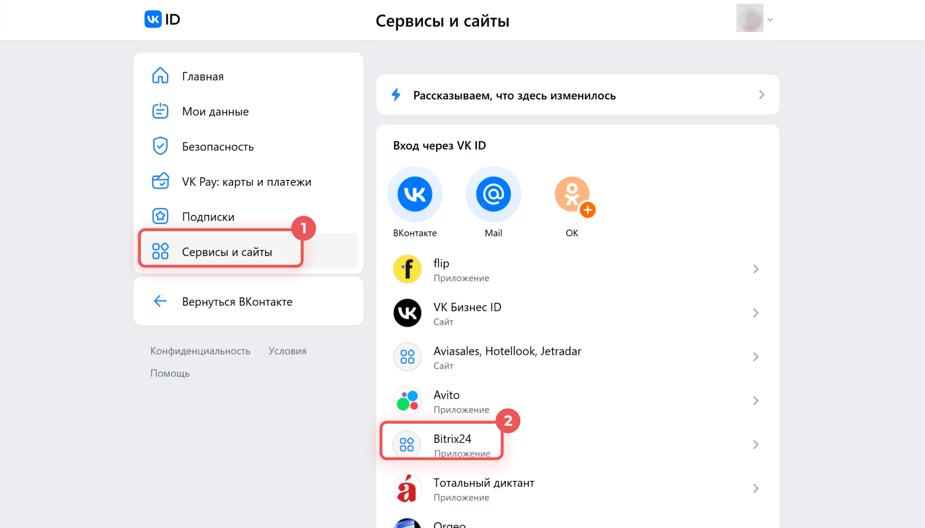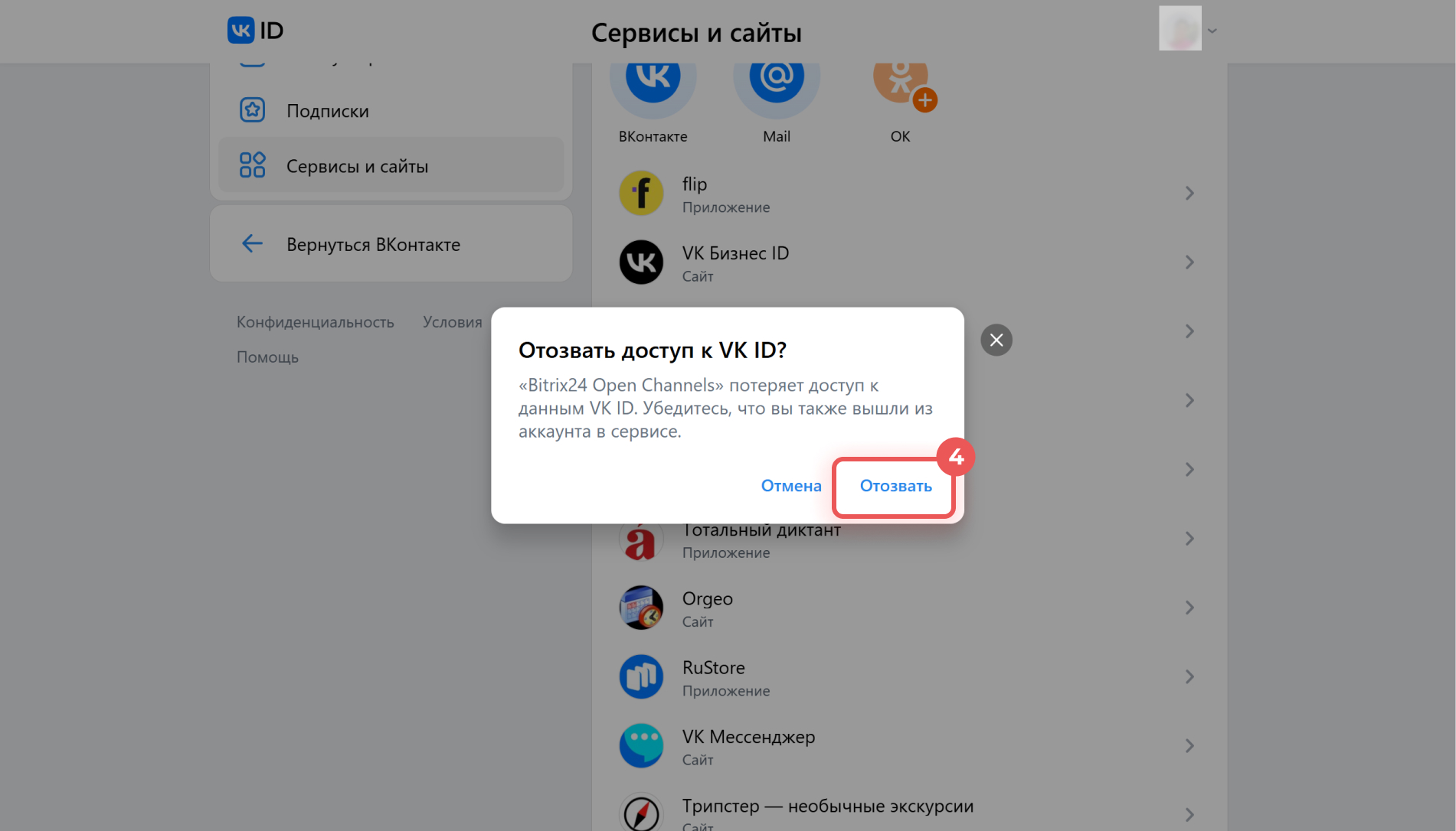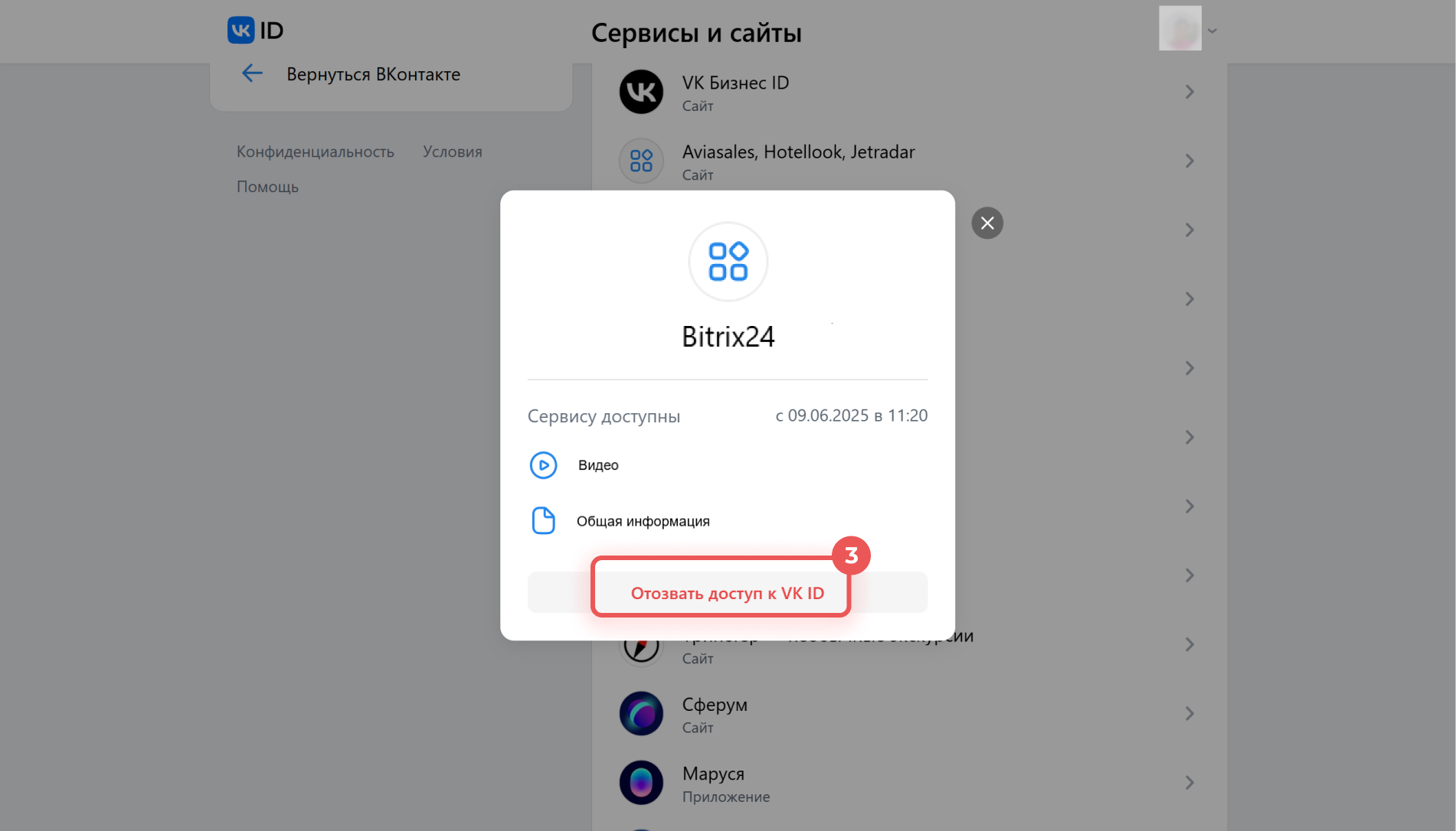2–4. Нажмите Bitrix24 > Отозвать доступ к VK ID > Отозвать.