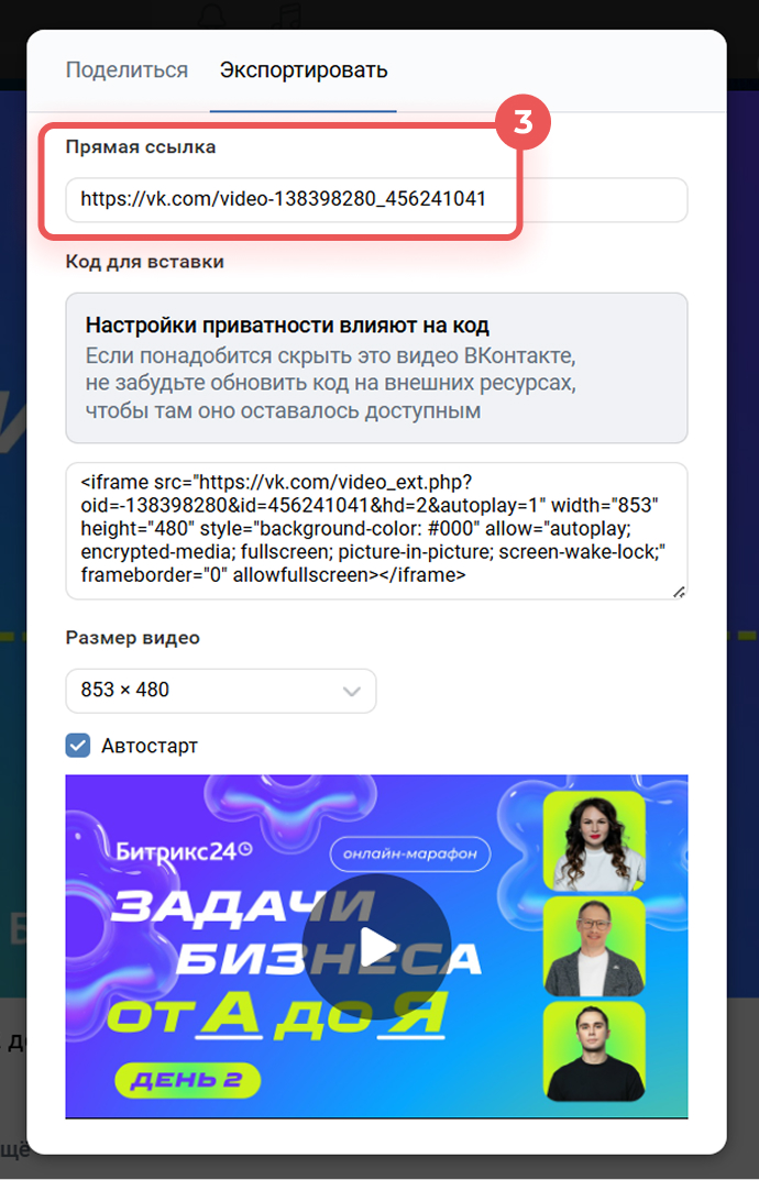 3. Скопируйте прямую ссылку на ролик — ее нужно будет указать при редактировании блока в Битрикс24.