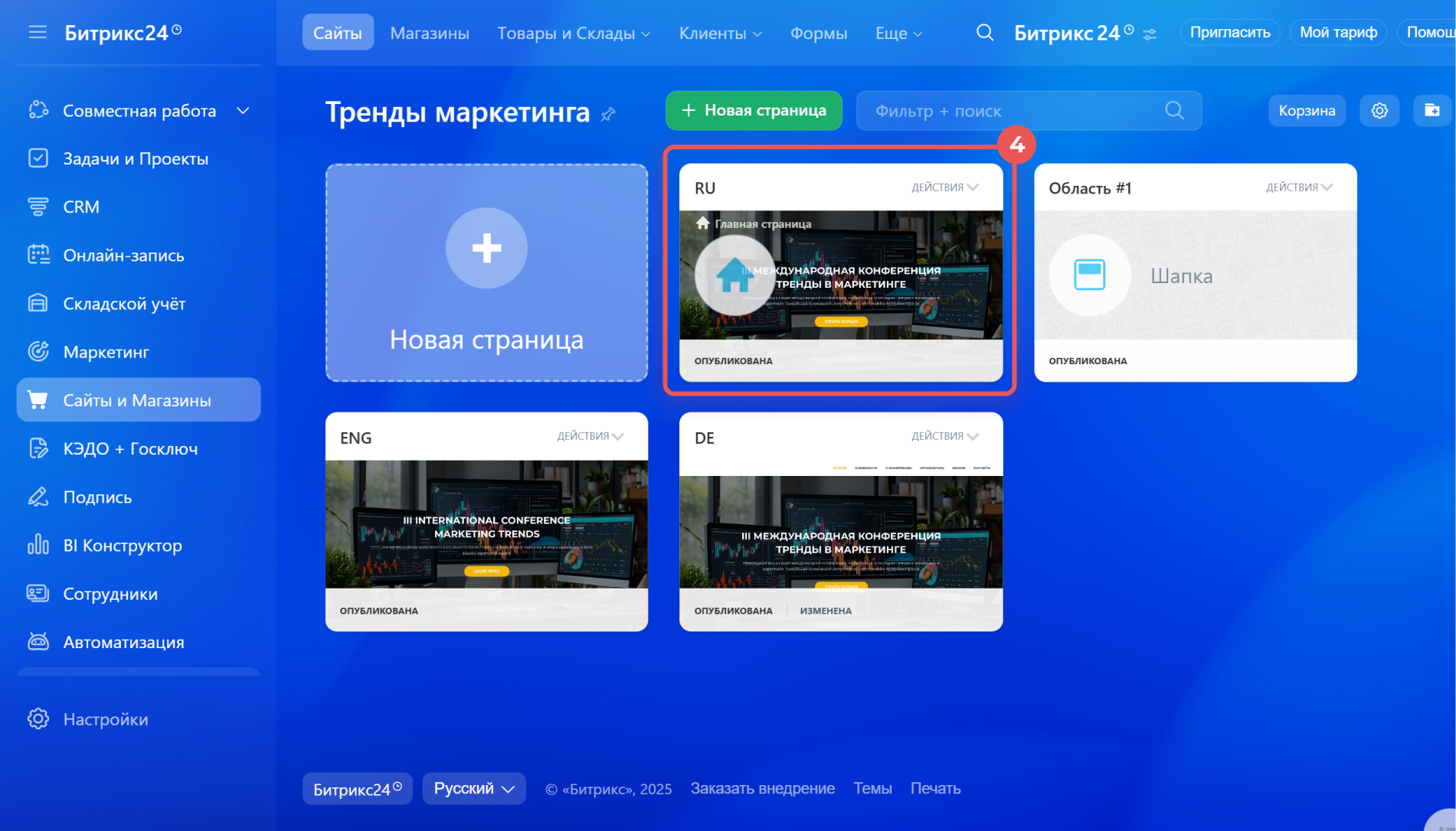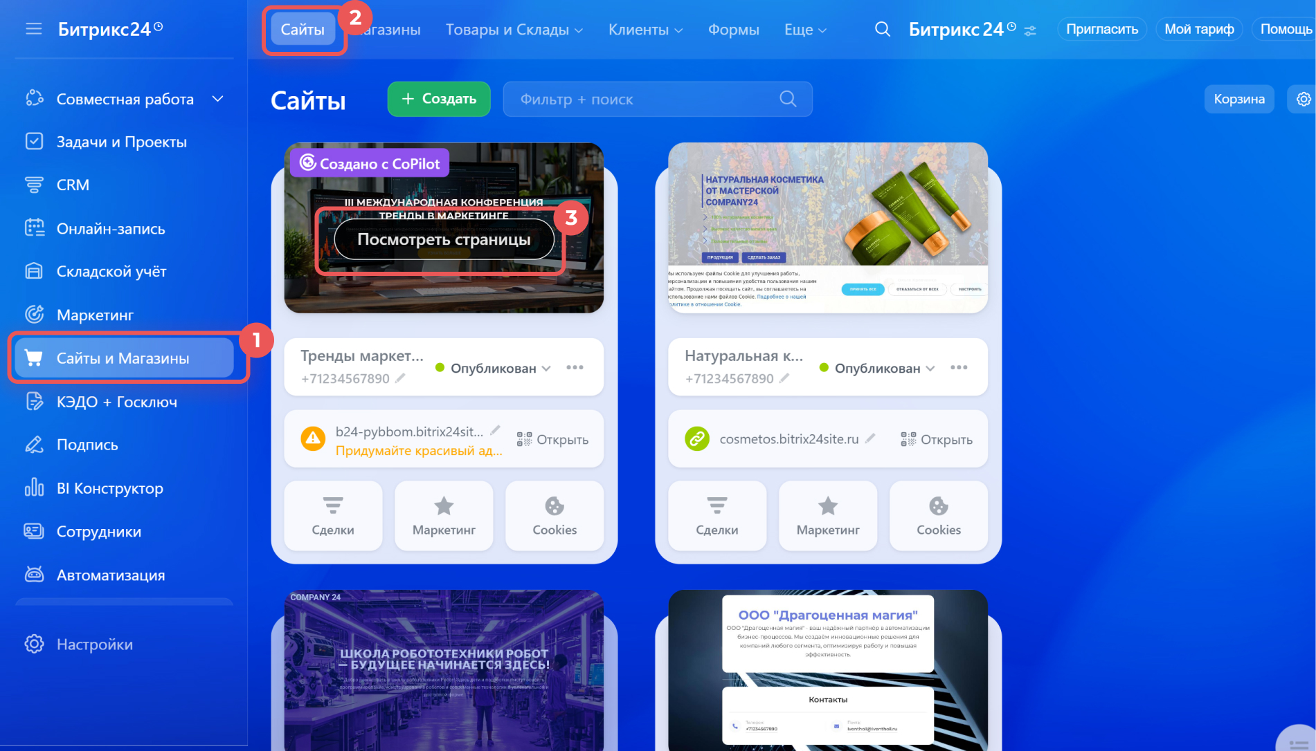 1–2. Перейдите в раздел Сайты и Магазины > Сайты.