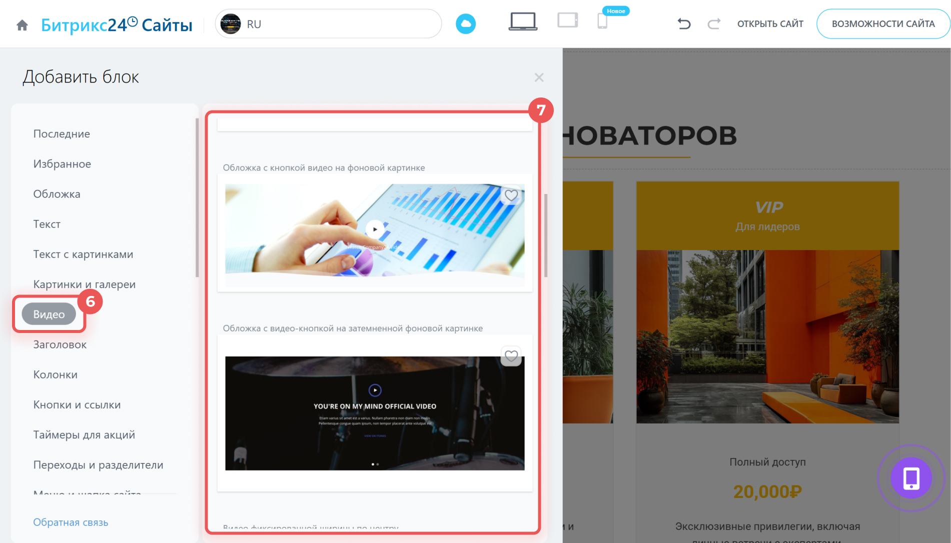 6–7. Перейдите на вкладку Видео и выберите шаблон. Например, Обложка с кнопкой видео на фоновой картинке.