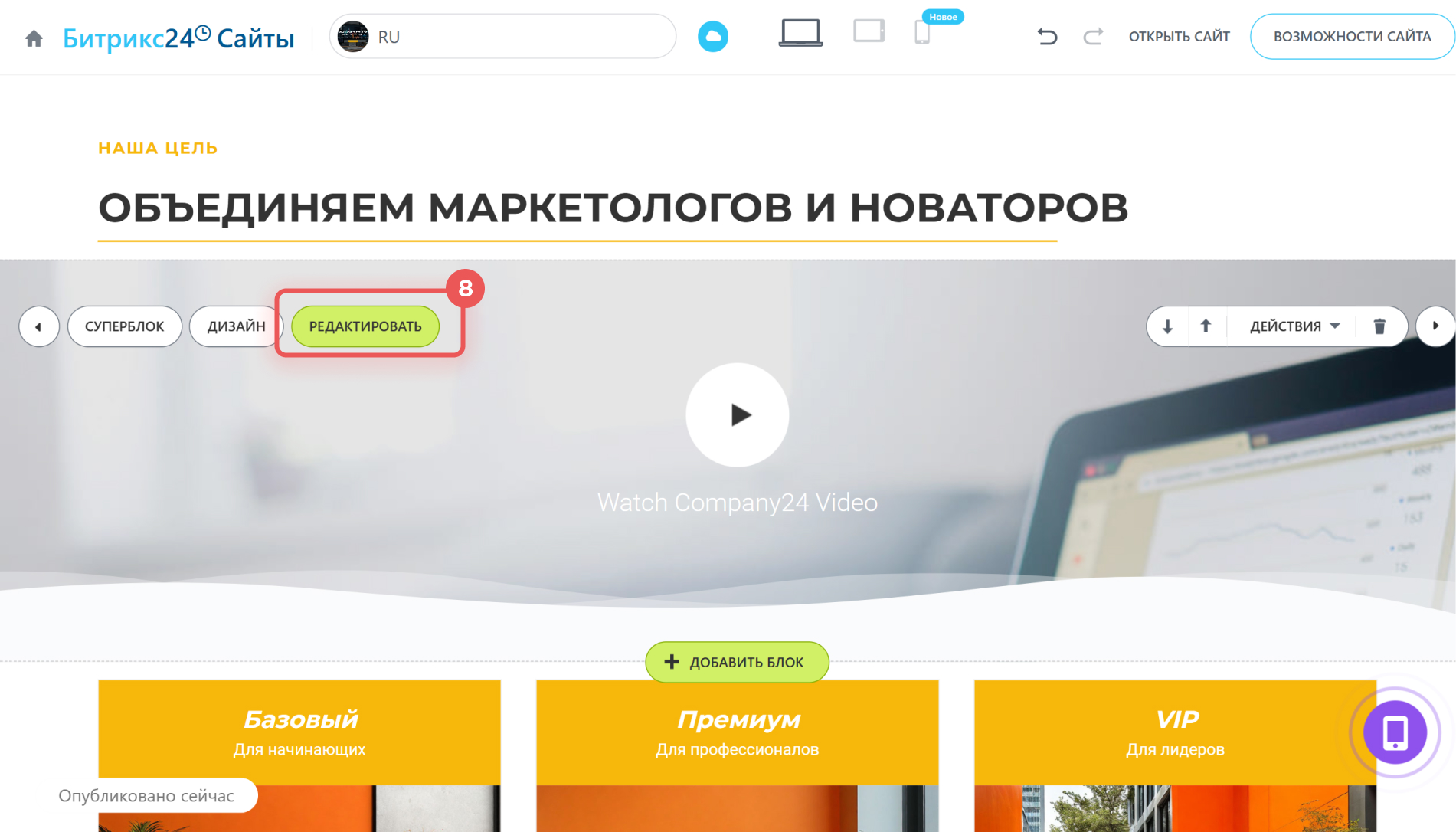 8. Нажмите Редактировать, чтобы настроить блок с видео.