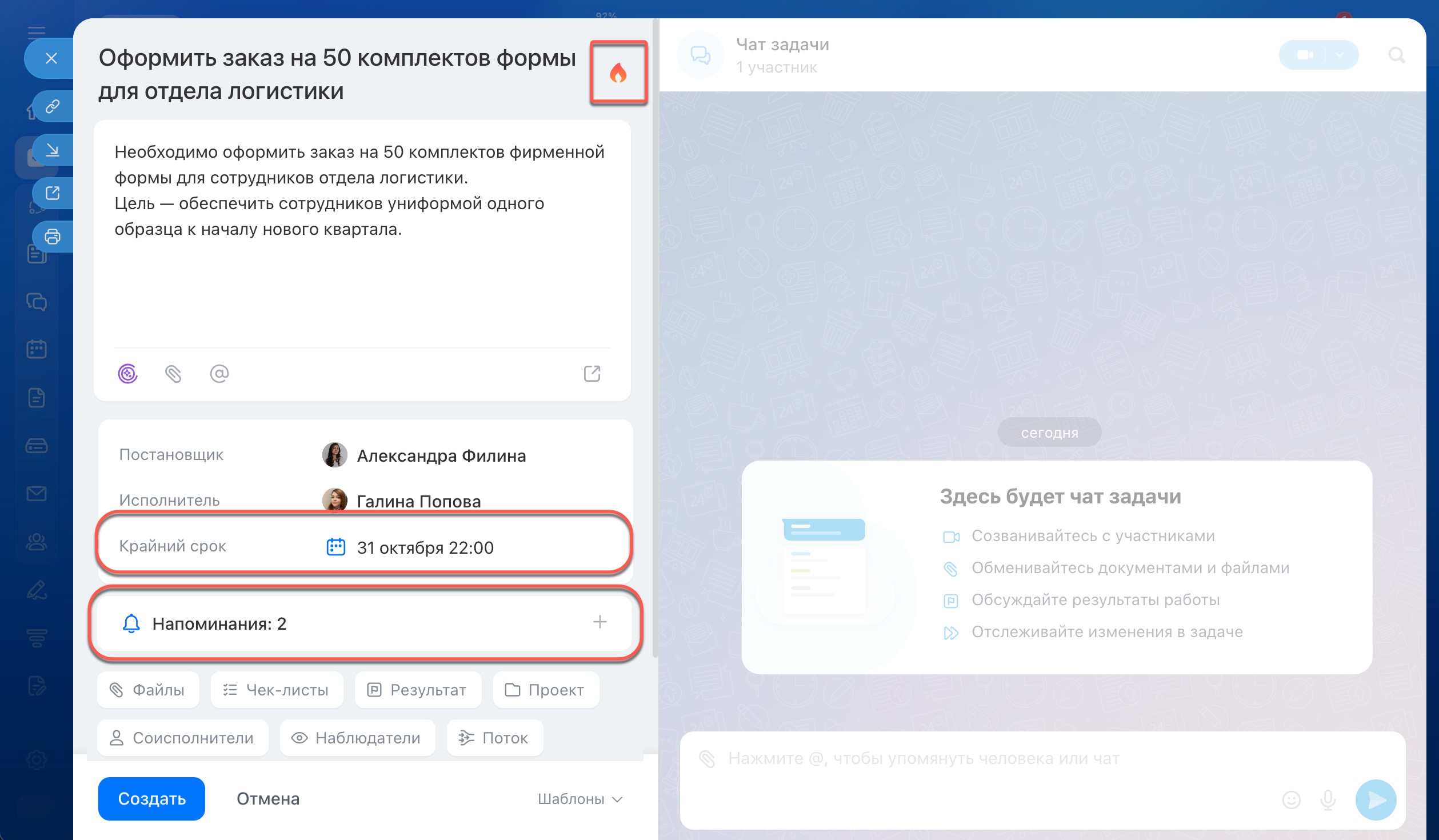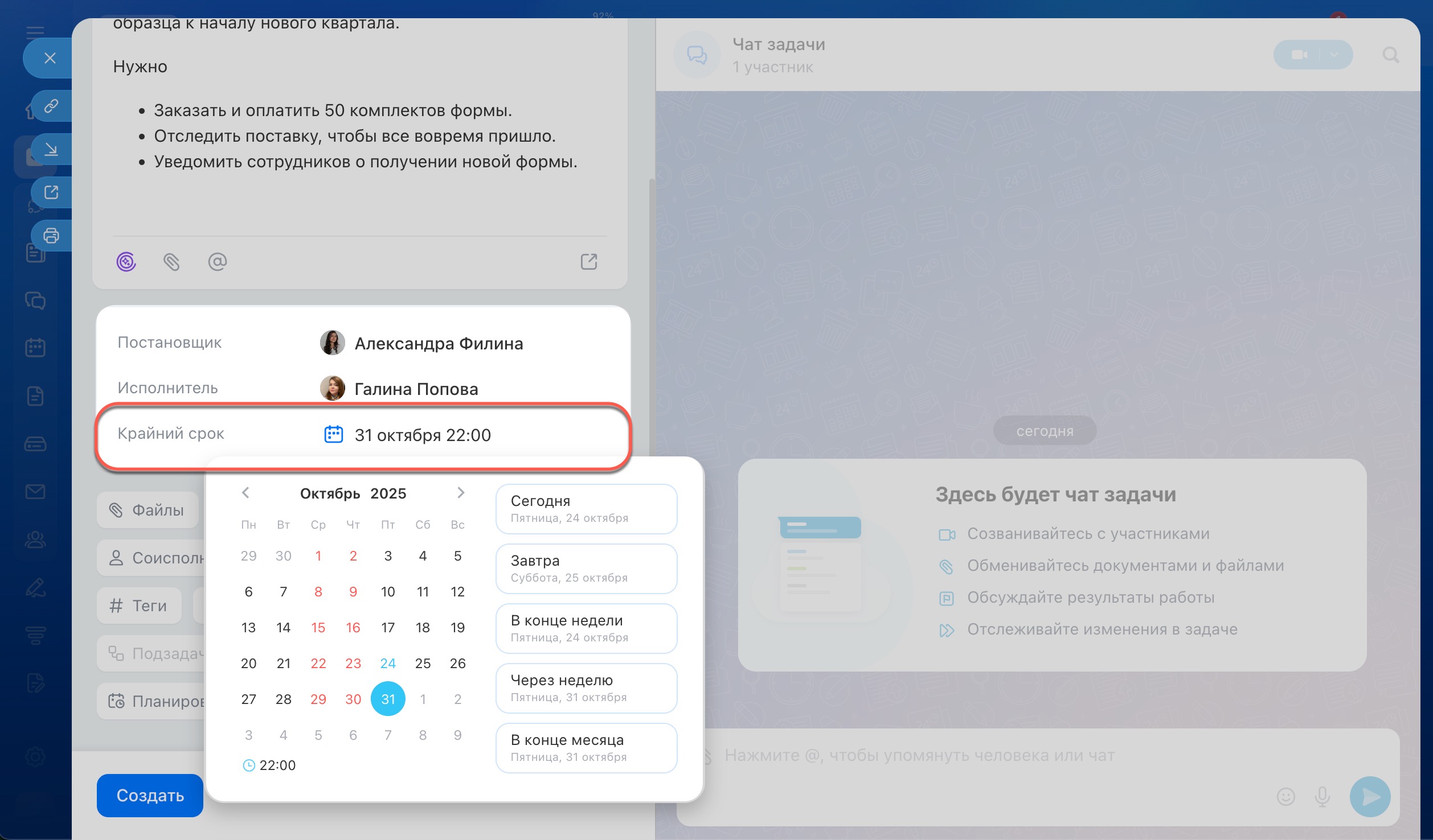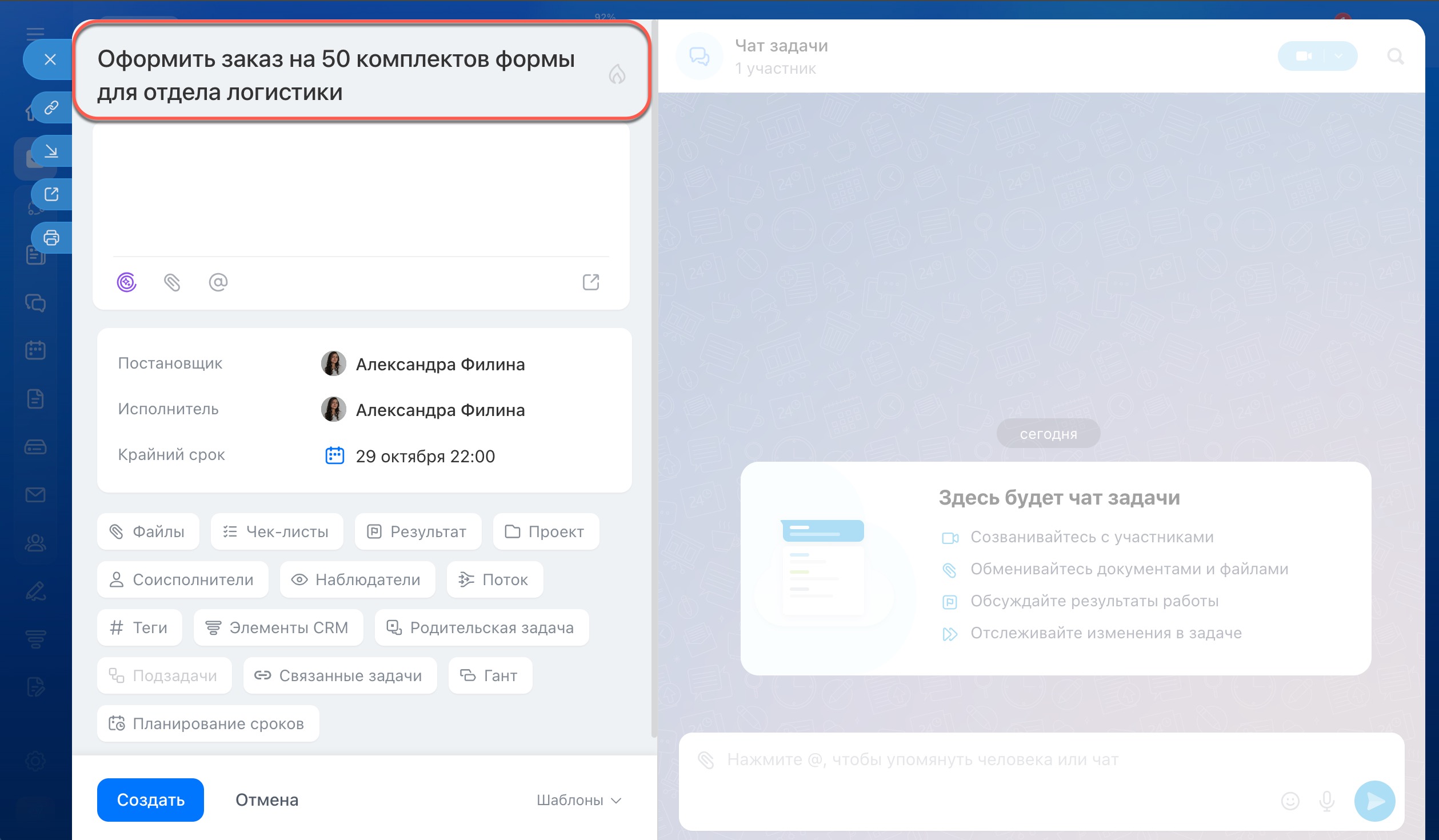 Базовые параметры — название, описание, исполнитель, срок — делают задачу понятной. Но в работе встречаются разные ситуации — от простого поручения «позвонить клиенту» до сложного проекта с командой и этапами.