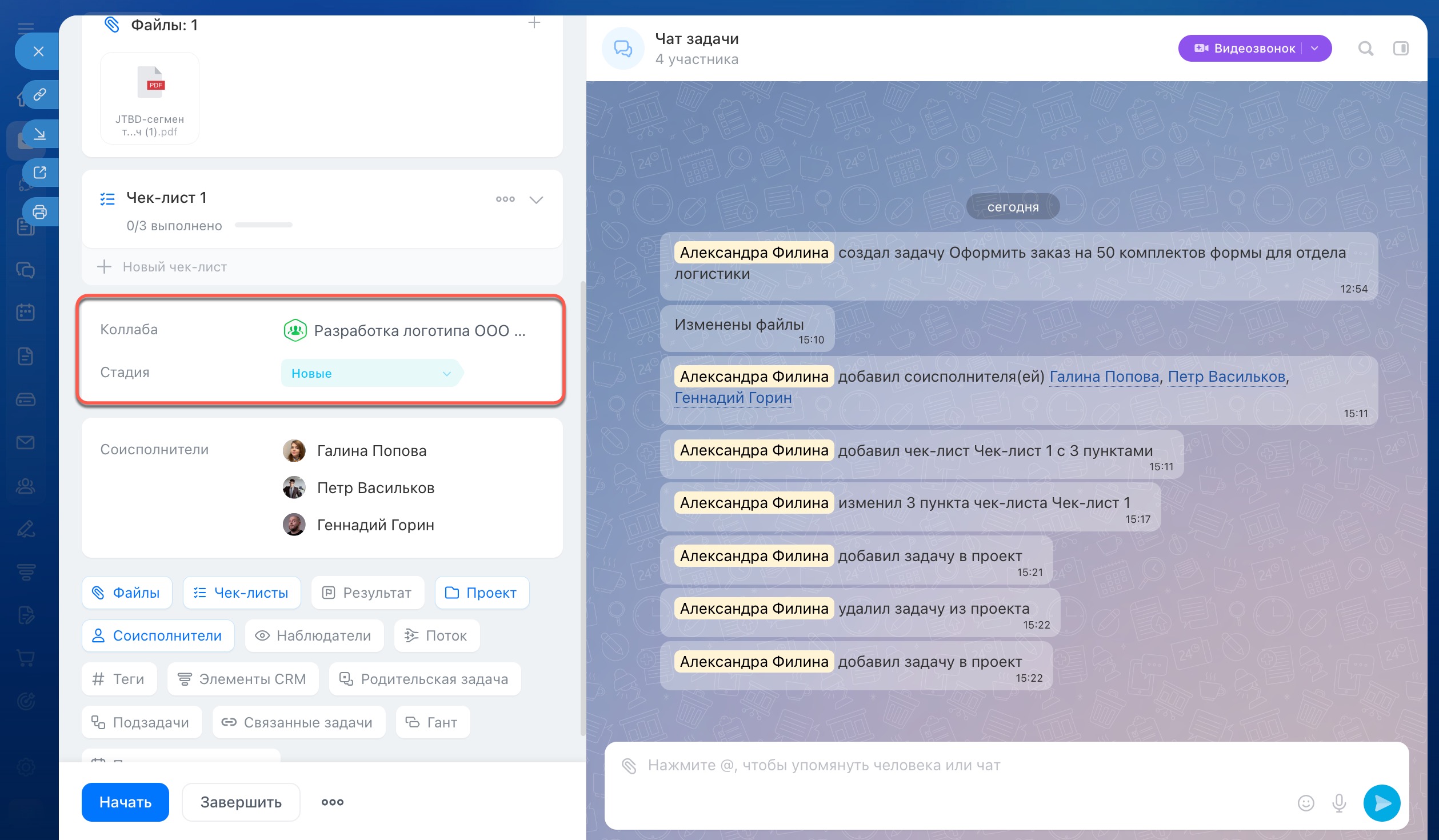 В работе над задачей могут участвовать не только сотрудники компании, но и внешние исполнители — подрядчики, партнеры или клиенты. Например, дизайнер-фрилансер готовит макет, а клиент согласовывает этапы проекта.