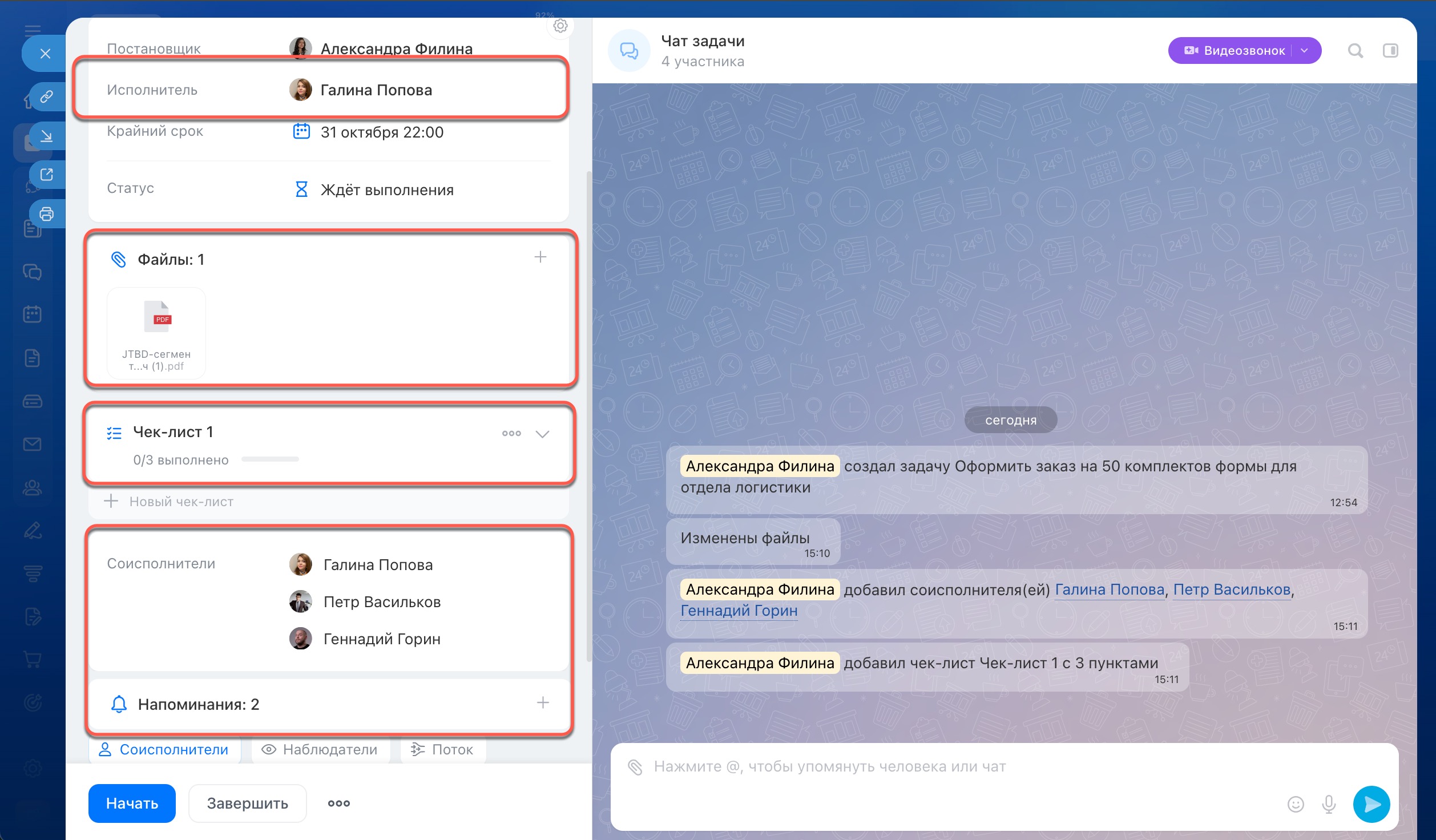 - Нужно распределить обязанности между участниками — чтобы было ясно, кто за что отвечает. Например, маркетолог готовит презентацию, а администратор бронирует переговорную — оба добавлены в задачу