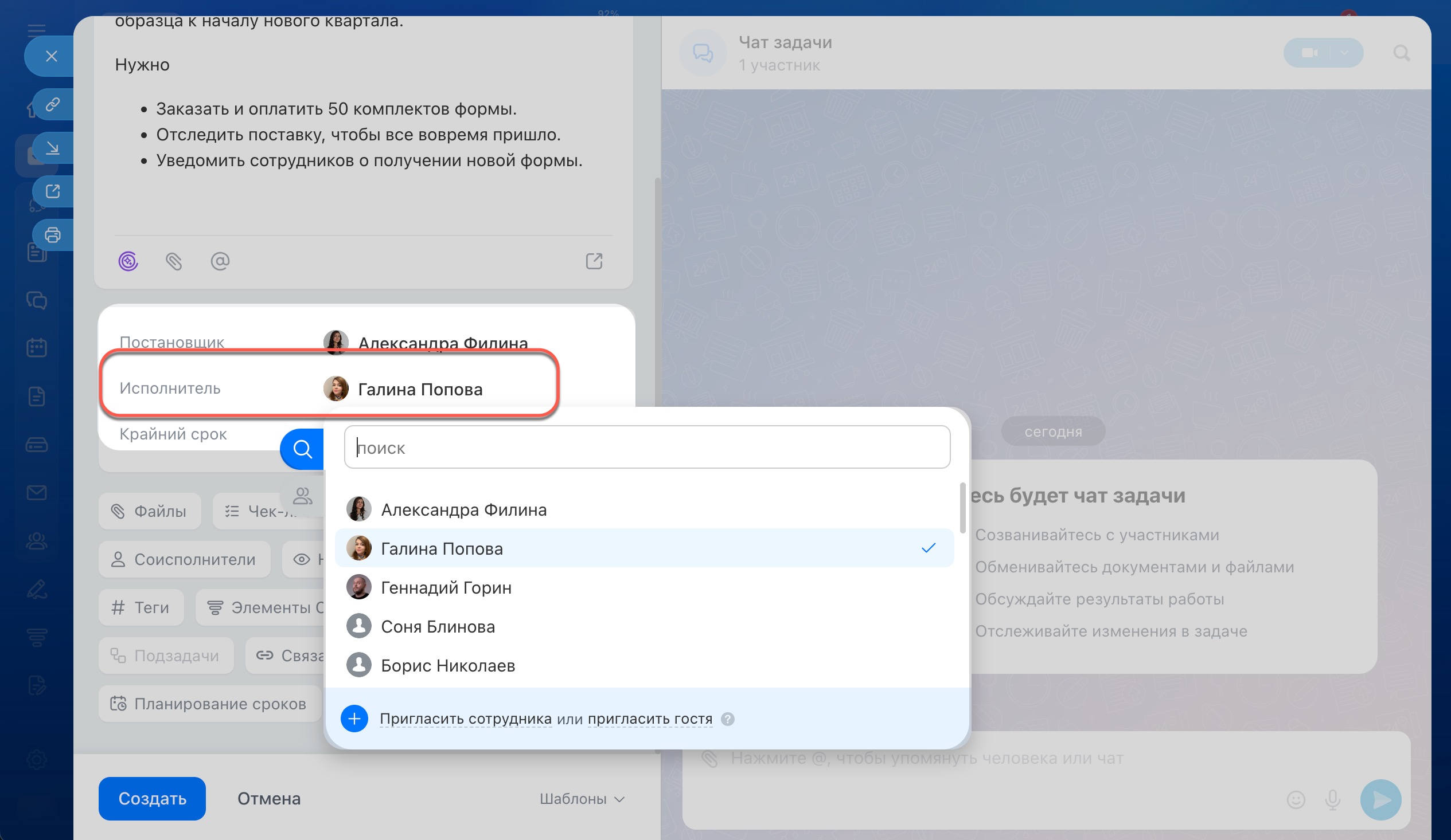 Исполнитель — выберите сотрудника, который будет выполнять задачу. В одной задаче — один исполнитель.