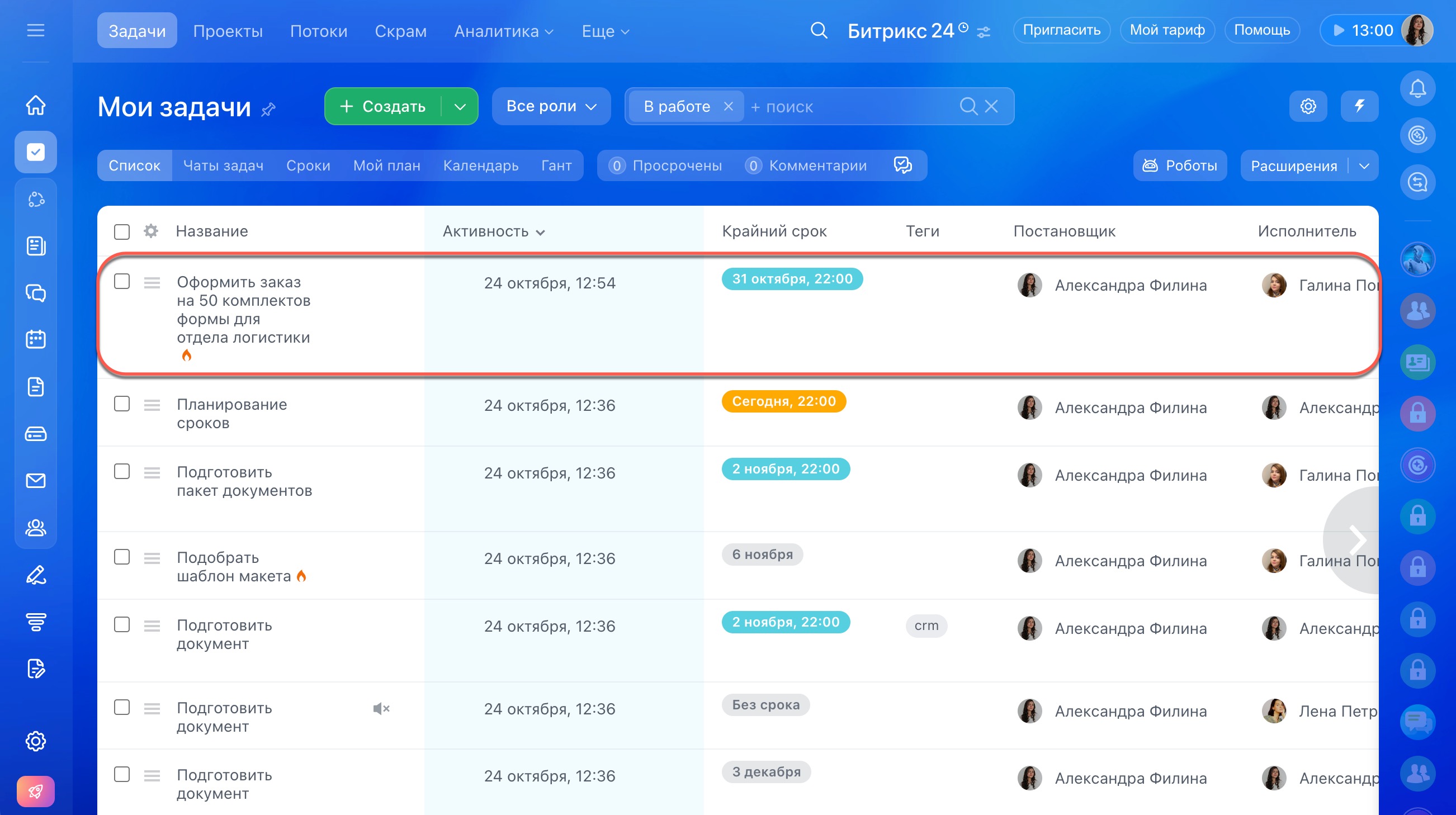 В Битрикс24 работа с задачами ведется в одном месте: у каждой есть исполнитель, срок и статус. Руководитель всегда видит, кто отвечает за работу, на какой стадии находится задача и к какому времени она должна быть выполнена.