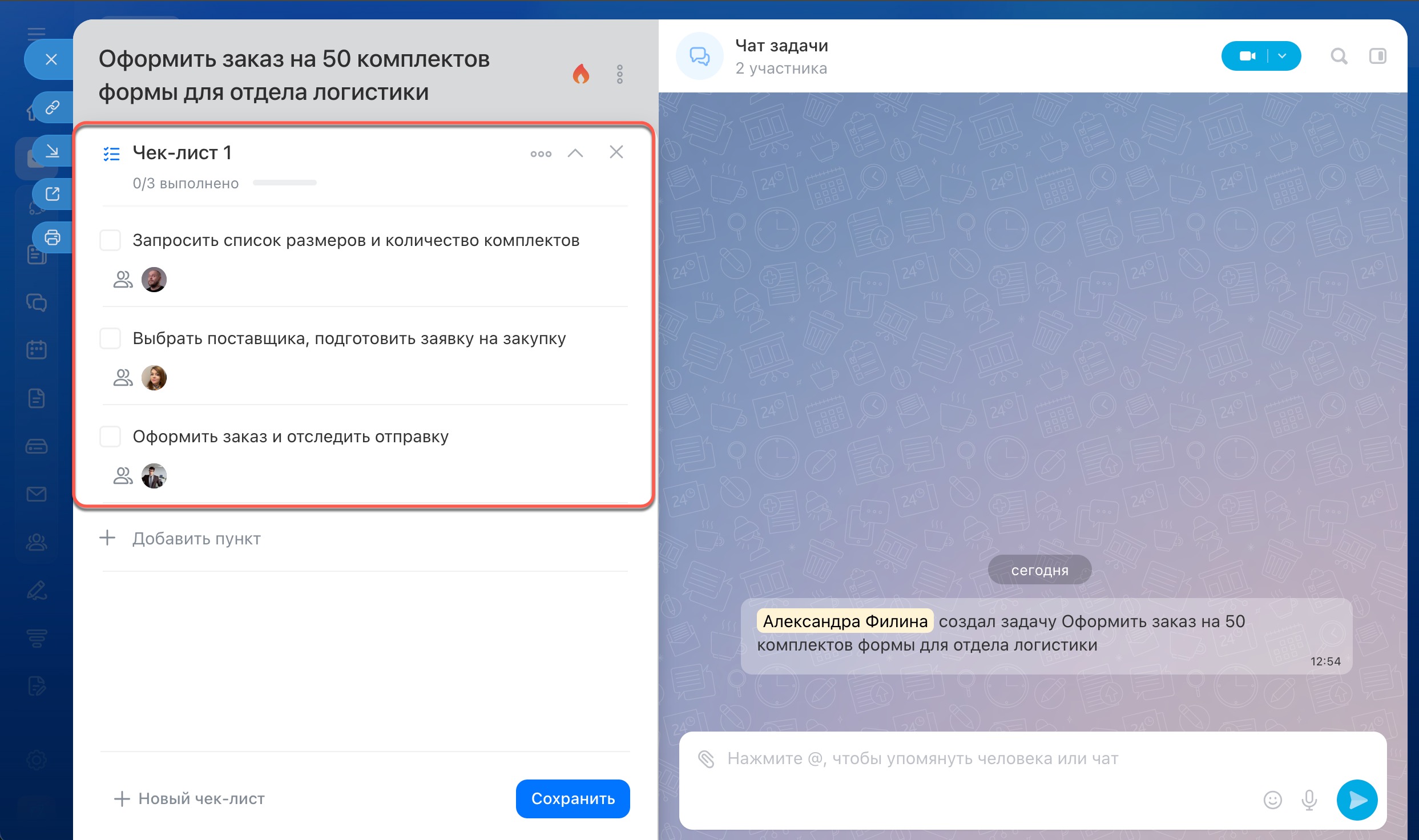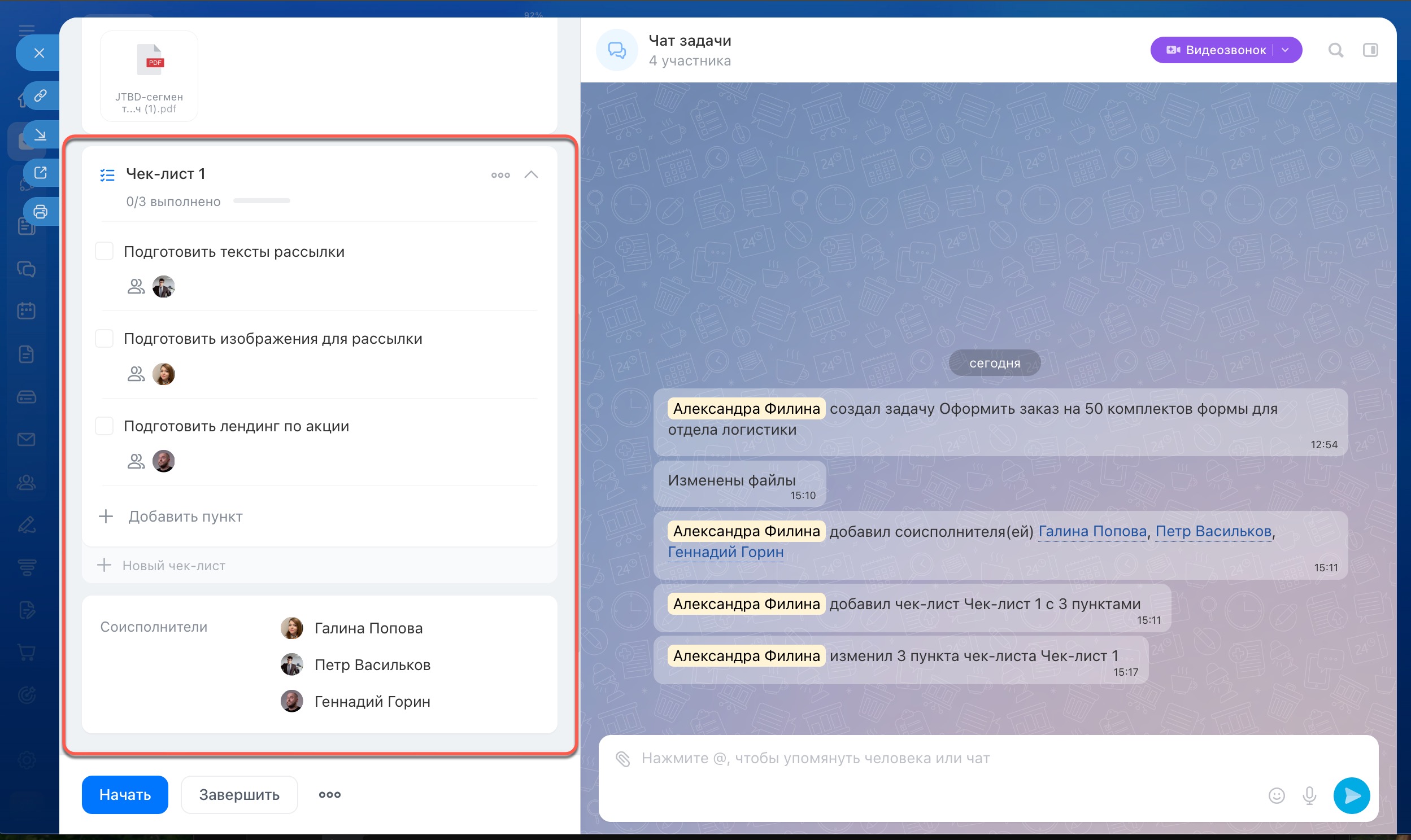 Используйте чек-листы, чтобы разделить задачу на конкретные шаги и закрепить их за соисполнителями. Это помогает каждому понимать, что именно нужно сделать, а руководителю — видеть прогресс и быть уверенным, что ни один этап не будет пропущен.