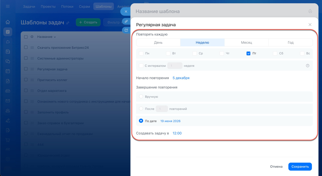Настройте график повторения задачи: ежедневно, еженедельно, ежемесячно или по собственному расписанию. Настройте, с какой даты задачи будут автоматически создаваться и до какой даты их нужно ставить. Это помогает сотрудникам работать по понятному графику, а руководителю быть уверенным, что регулярные процессы выполняются вовремя.